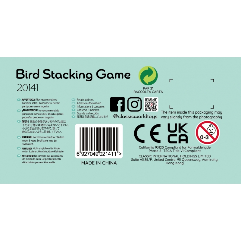 Drewniana gra edukacyjna od marki CLASSIC WORLD pozwala bawić się maluchom w wiele wyjątkowych gier - tylko wyobraźnia jest ograniczeniem! Gra składa się z 20 prostokątnych klocków, 2 figurek ptaków oraz kostki do gry, wszystkie wykonane z drewna bukowego. Zabawkę można wykorzystać do różnych gier i zabaw. Jedną z najbardziej popularnych jest Zabawa w krzywą wierzę - to popularna gra zręcznościowa, polegająca na wyciąganiu drewnianych klocków z wieży i układaniu ich na jej szczycie, bez spowodowania zawalenia konstrukcji.