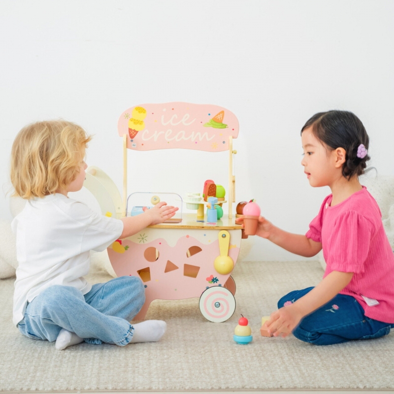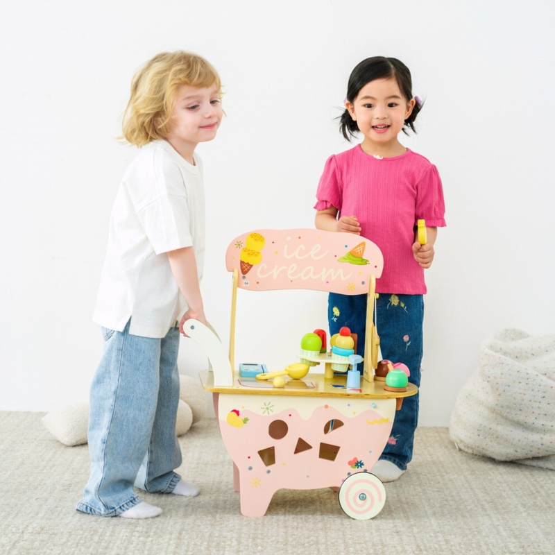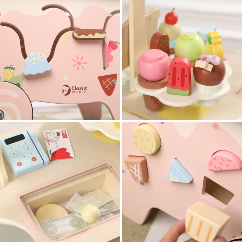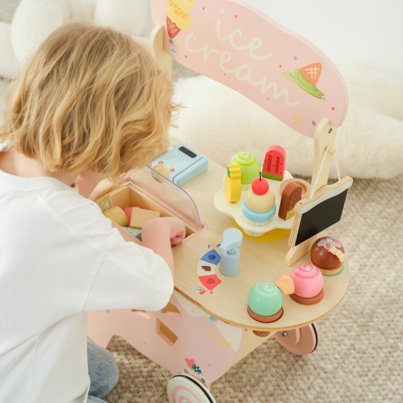 Drewniany Wózek Lodziarnia od marki CLASSIC WORLD to idealny prezent dla każdego małego fana słodkości i zabawy w sprzedawcę. Ten uroczy pchacz łączy funkcję stabilnego chodzika z bogato wyposażonym stanowiskiem do sprzedaży lodów, oferując dziecku 40 elementów do kreatywnej zabawy. Jest to wspaniała zabawka do odgrywania ról, która zachęca do interakcji i nauki. Dzieci mogą pchać wózek, serwować lody i wymyślać własne scenariusze zabawy, co w naturalny sposób rozwija ich umiejętności społeczne i kreatywność.