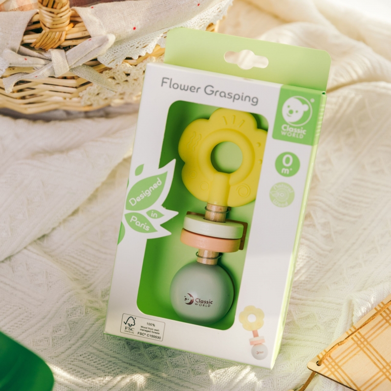 Urocza grzechotka w kształcie kwiatka zaprojektowana została z myślą o najmłodszych dzieciach. Delikatne, pastelowe kolory przyciągają uwagę maluszka, a przyjemna w dotyku powierzchnia i odpowiedni rozmiar sprawiają, że łatwo ją chwycić i potrząsać. Zabawka została stworzona z bezpiecznych materiałów – drewna i silikonu – dzięki czemu nadaje się dla dzieci już od pierwszych dni życia.