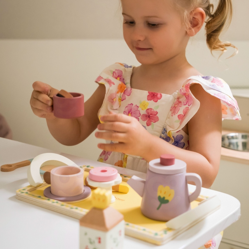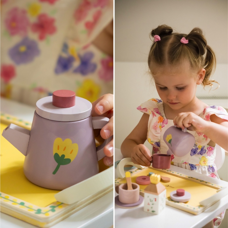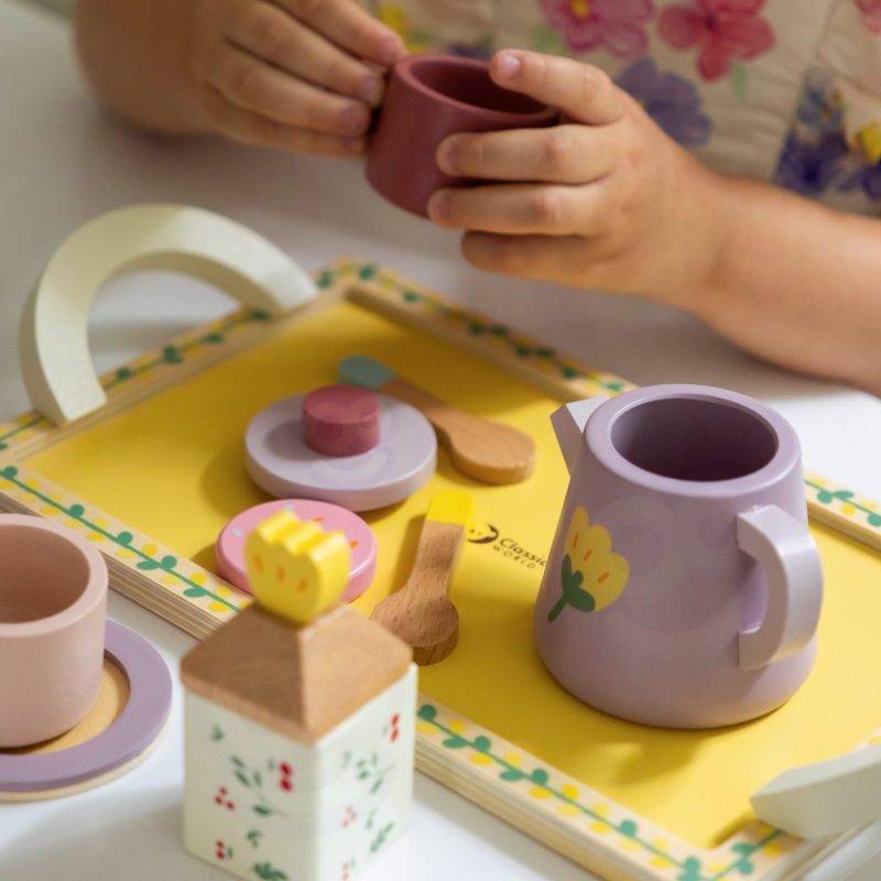Drewniany zestaw do herbaty i deserów sprawi, że dziecko będzie mogło przyjmować gości i serwować herbatę oraz desery całej rodzinie. Nauczy dobrych manier i umiejętności dzielenia się z innymi podczas zabawy.