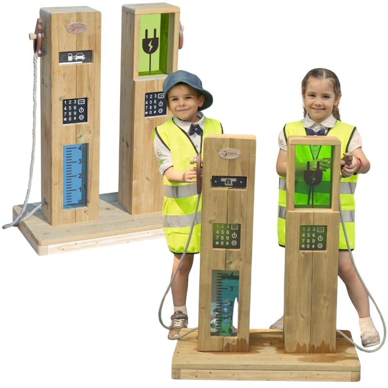Stacja ładowania 2 w 1 marki CLASSIC WORLD jest wszechstronnym urządzeniem, które z jednej strony służy do ładowania paliwa, a z drugiej do ładowania pojazdów elektrycznych. Dzieci mogą brać przewód ładujący, podłączać go do wózków trójkołowych i ładować je przed wyruszeniem w podróż. Funkcje takie jak tankowanie, konserwacja i płatność można symulować, obracając przycisk funkcyjny.