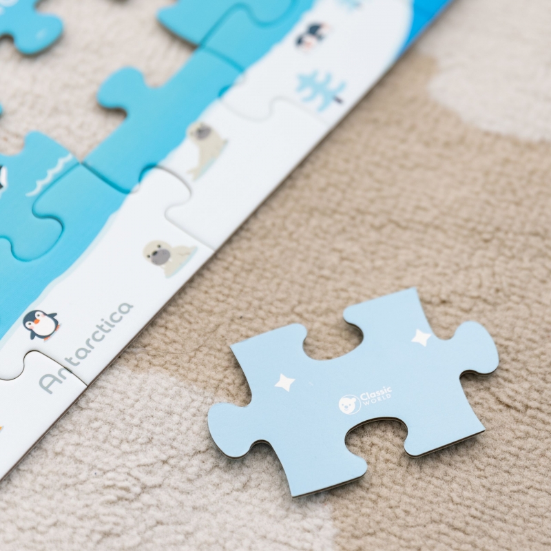 Zabierz swoje dziecko w fascynującą podróż dookoła świata. Drewniane puzzle Mapa Świata od CLASSIC WORLD to edukacyjna zabawka, która wciągnie każdego małego odkrywcę na długie godziny. Zestaw składa się z 48 elementów z żywymi, szczegółowymi ilustracjami, które układają się w kolorową mapę kontynentów. Podczas dopasowywania kolejnych fragmentów maluch rozwija swoją wyobraźnię, zdolności manualne oraz poznawcze. To świetny sposób na naukę przez zabawę a dzięki wysokiej jakości wykonania i bezpiecznym materiałom, rodzice mogą być spokojni o bezpieczeństwo dziecka.