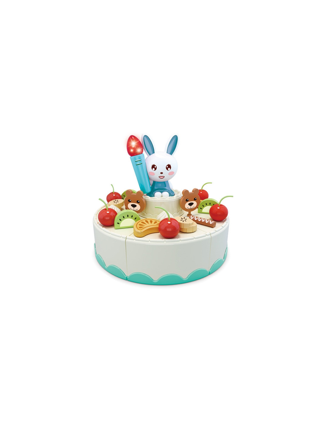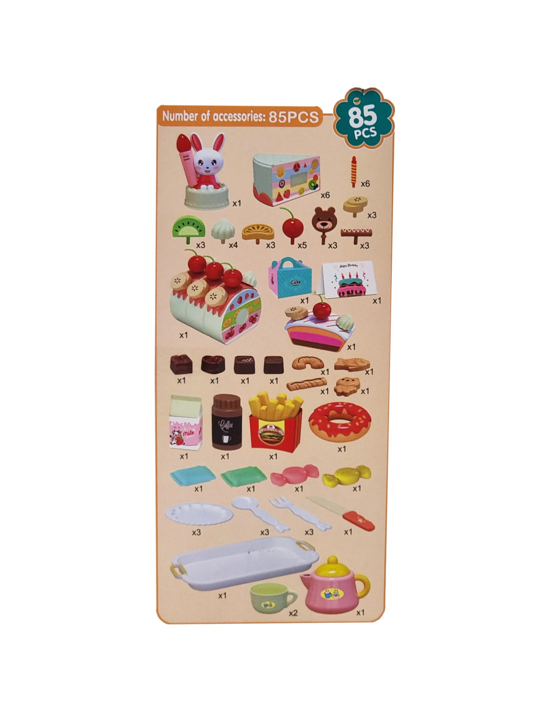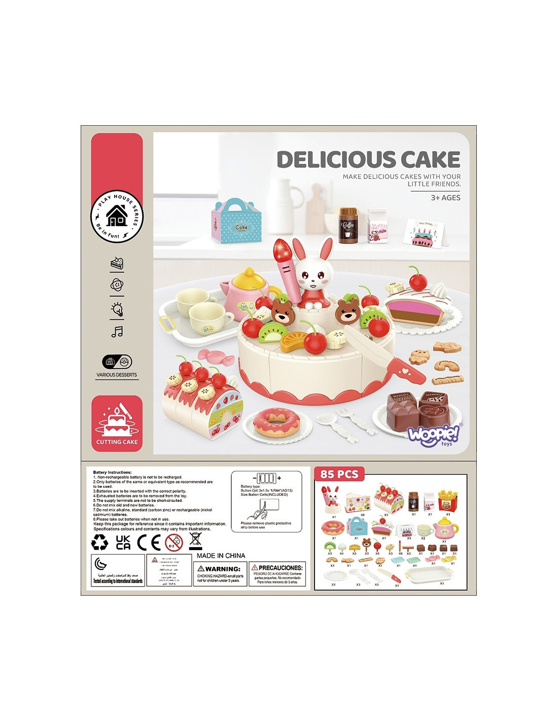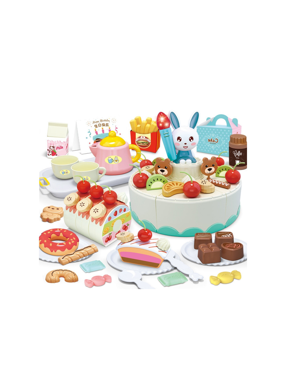 The Woopie Bakery set is the perfect choice for gatherings with friends. It 's the perfect addition to any little hostess or hostess, perfect for organizing an unforgettable party. Children can take on the role of a grown-up host. The set contains 85 pieces. The set includes a beautifully decorated birthday cake and a cake , which can be cut onto plates and served to guests. A bunny candle lights up and sings the classic "Happy Birthday to You" to create a birthday atmosphere. A button activates the melody, allowing children to make a wish and blow out the candle, which will go off when blown out. The uneaten cake can be stored in the box. Everyone will find something to enjoy; you can even eat fries and drink coffee or milk. All the pieces are perfectly reproduced and look real. Children can even write their wishes on a birthday card. Role-playing positively develops children's imagination , creativity , and awareness of everyday life.