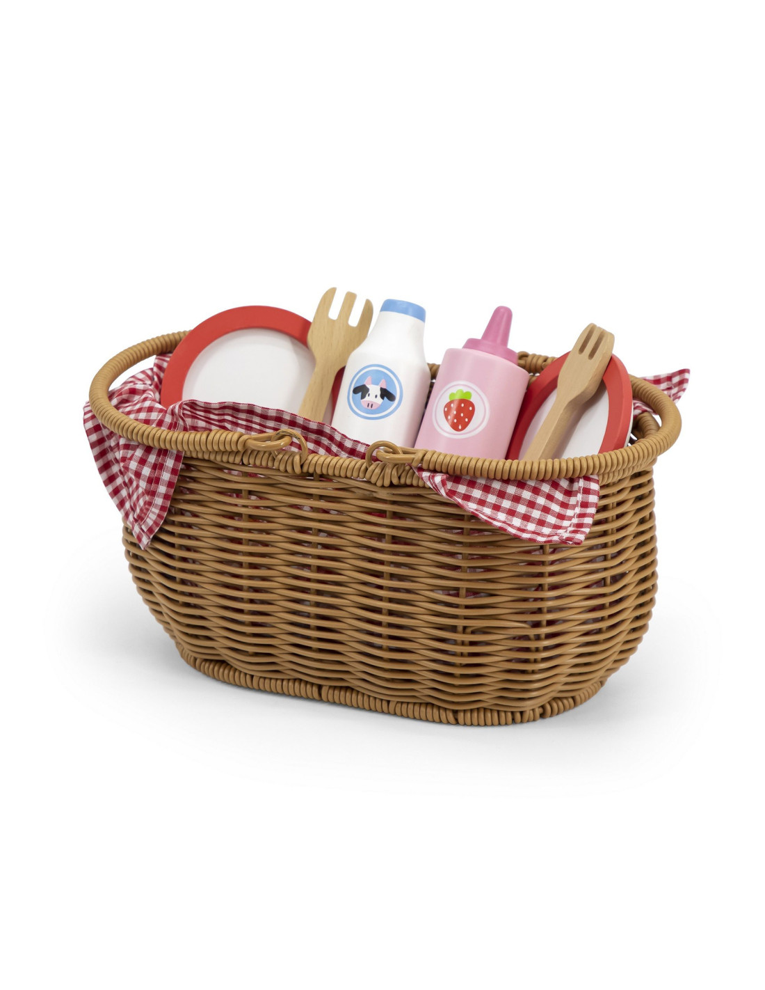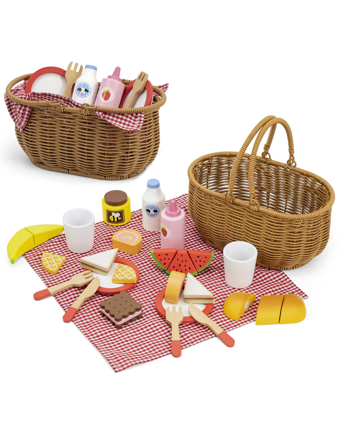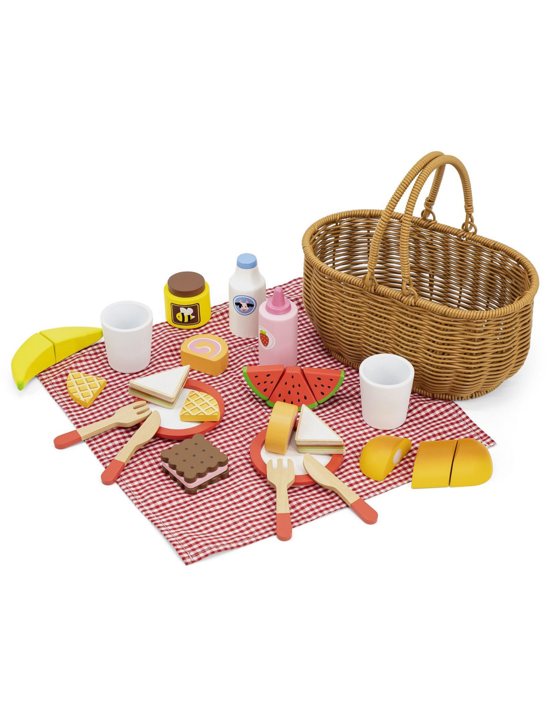 Go on a fun picnic with friends with the Wooden Picnic Set from VIGA . This beautiful basket made of artificial reed is filled with a selection of wooden accessories and a checkered fabric. Thanks to the sturdy handles, your child can easily take the entire set with them wherever they go . The included wooden snacks and accessories allow them to take their favorite toys, stuffed animals, or role-play with a friend. This set is suitable for both outdoor and indoor play. Some dishes consist of several pieces and are attached with Velcro. Using a wooden knife, your child can cut them into pieces, developing fine motor skills . Imitating adults will also contribute to the development of social skills .
