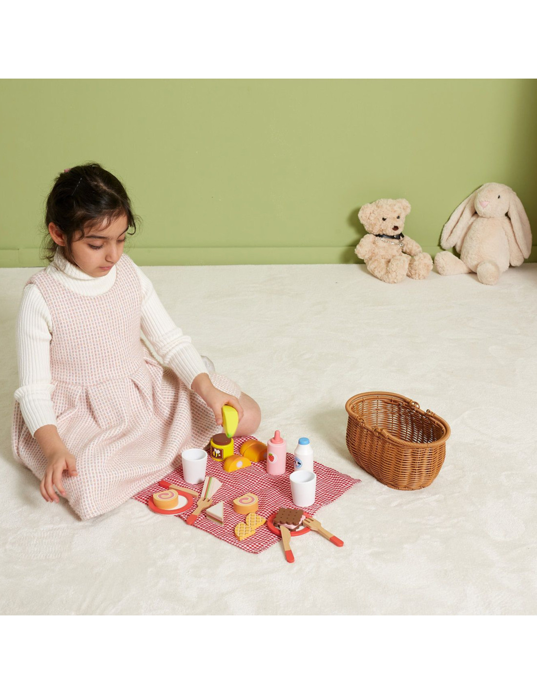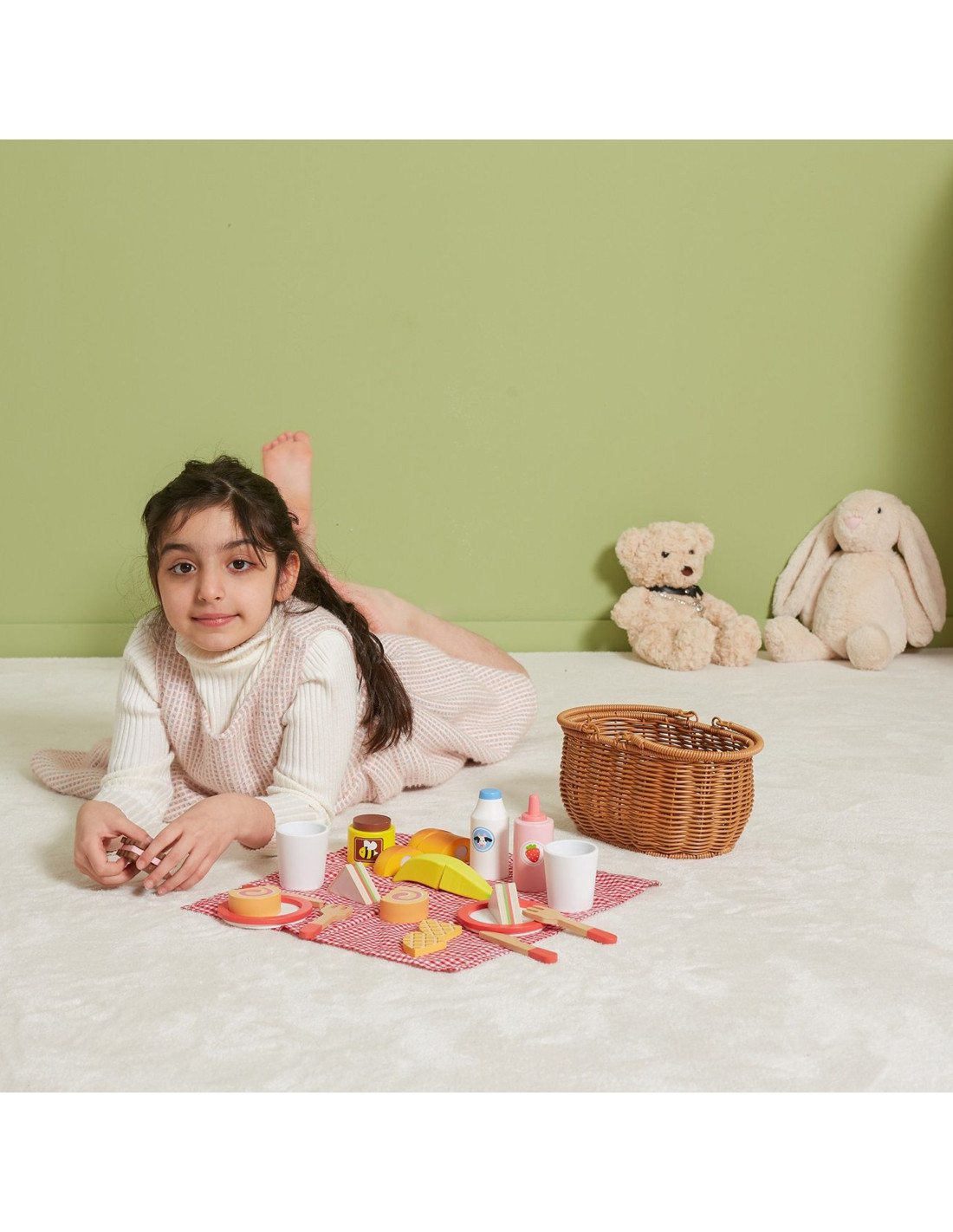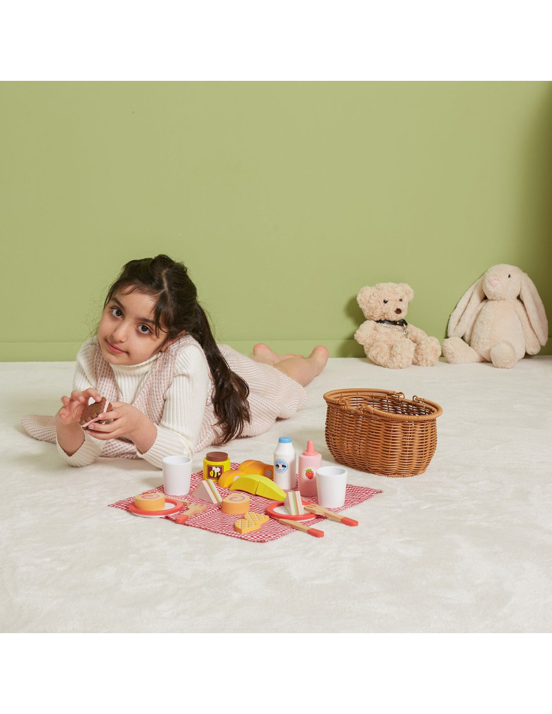 Go on a fun picnic with friends with the Wooden Picnic Set from VIGA . This beautiful basket made of artificial reed is filled with a selection of wooden accessories and a checkered fabric. Thanks to the sturdy handles, your child can easily take the entire set with them wherever they go . The included wooden snacks and accessories allow them to take their favorite toys, stuffed animals, or role-play with a friend. This set is suitable for both outdoor and indoor play. Some dishes consist of several pieces and are attached with Velcro. Using a wooden knife, your child can cut them into pieces, developing fine motor skills . Imitating adults will also contribute to the development of social skills .