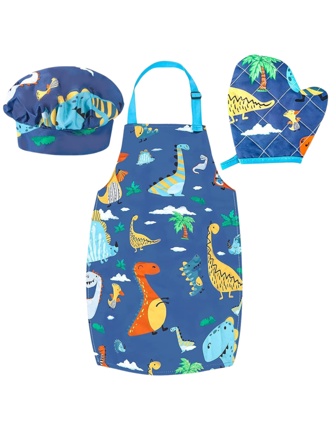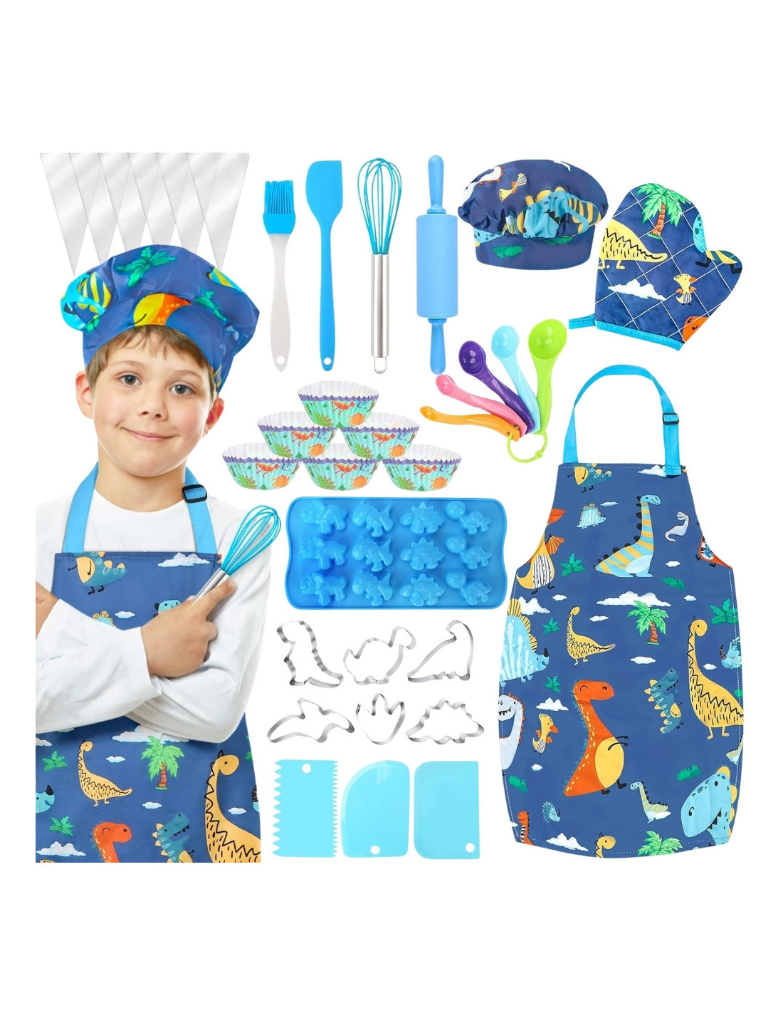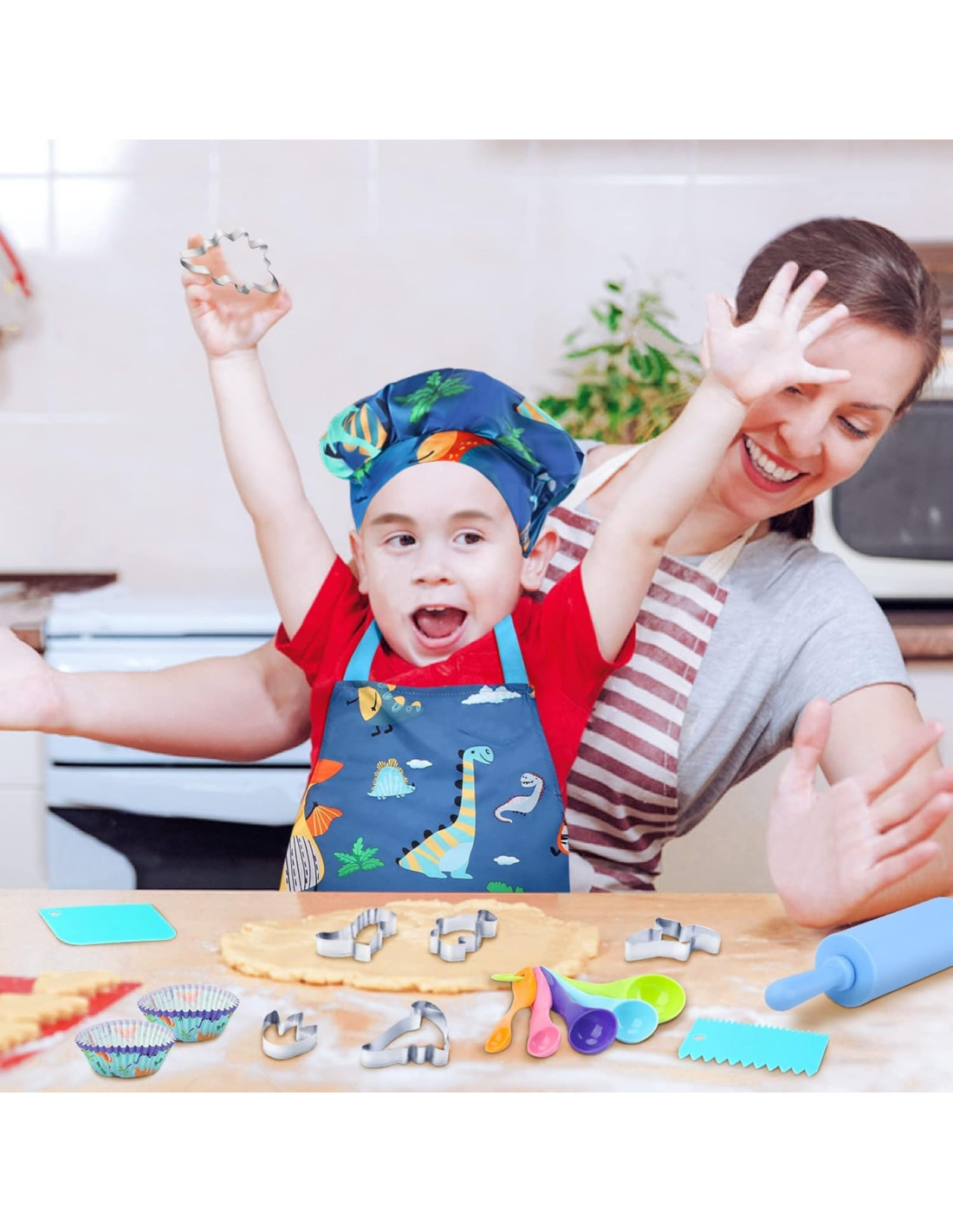 Bring the fun to the kitchen! The WOOPIE Little Chef's Dino Set is a colorful set of kitchen accessories for kids that combines learning with culinary fun. A charming dinosaur-themed apron and hat, safe tools , and silicone molds encourage collaborative cooking. Adjustable straps, soft material, and lightweight utensils make the set comfortable and perfect for little hands.