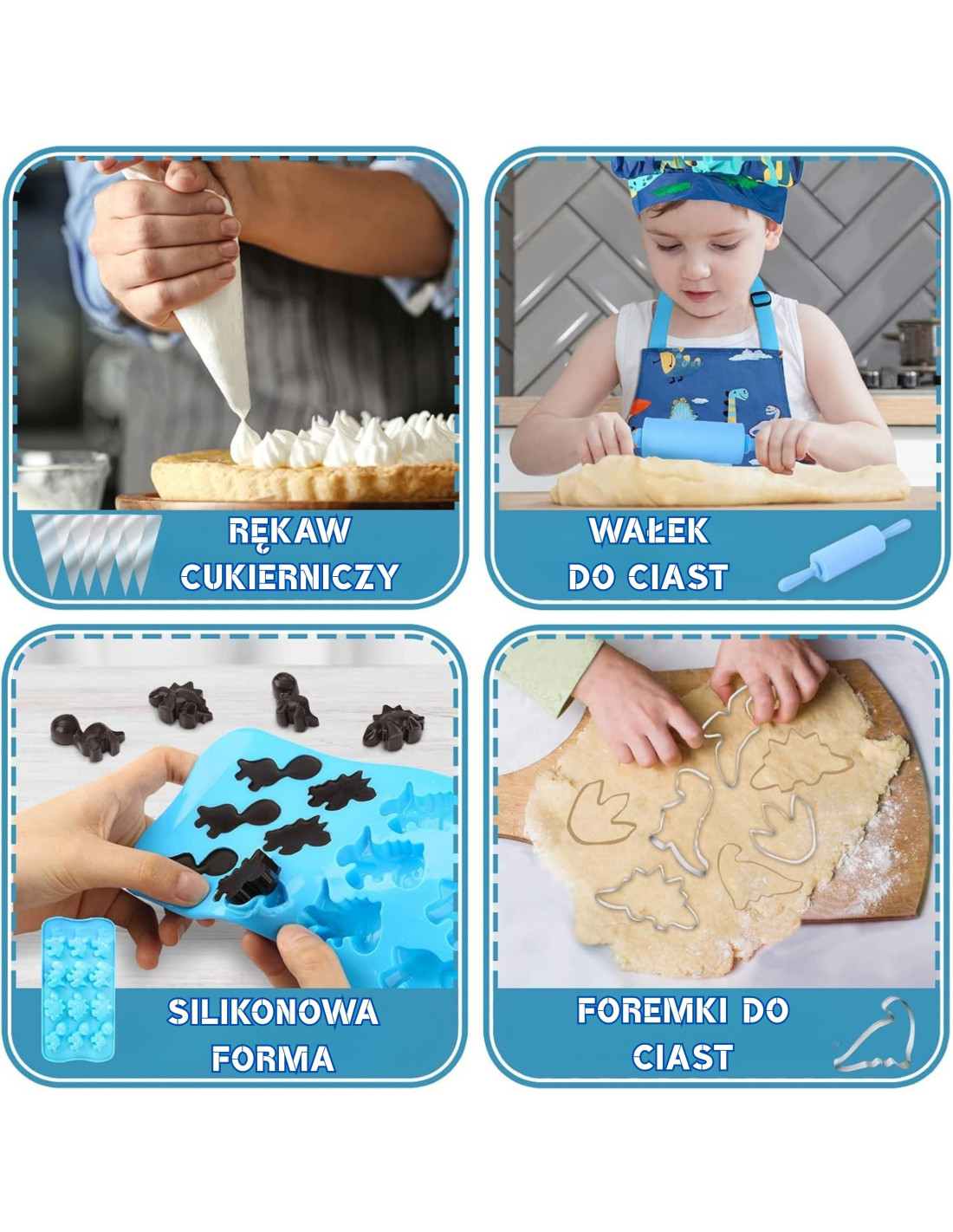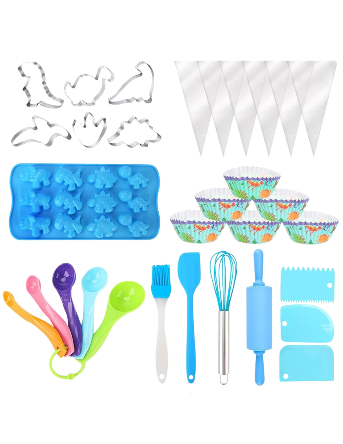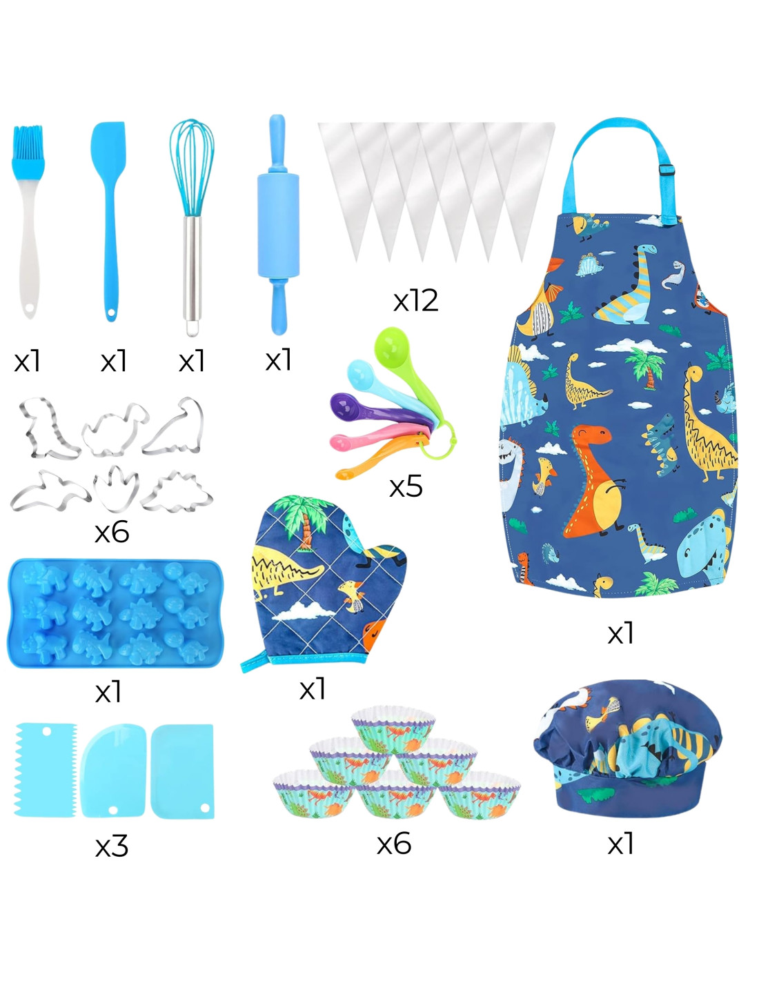 Bring the fun to the kitchen! The WOOPIE Little Chef's Dino Set is a colorful set of kitchen accessories for kids that combines learning with culinary fun. A charming dinosaur-themed apron and hat, safe tools , and silicone molds encourage collaborative cooking. Adjustable straps, soft material, and lightweight utensils make the set comfortable and perfect for little hands.
