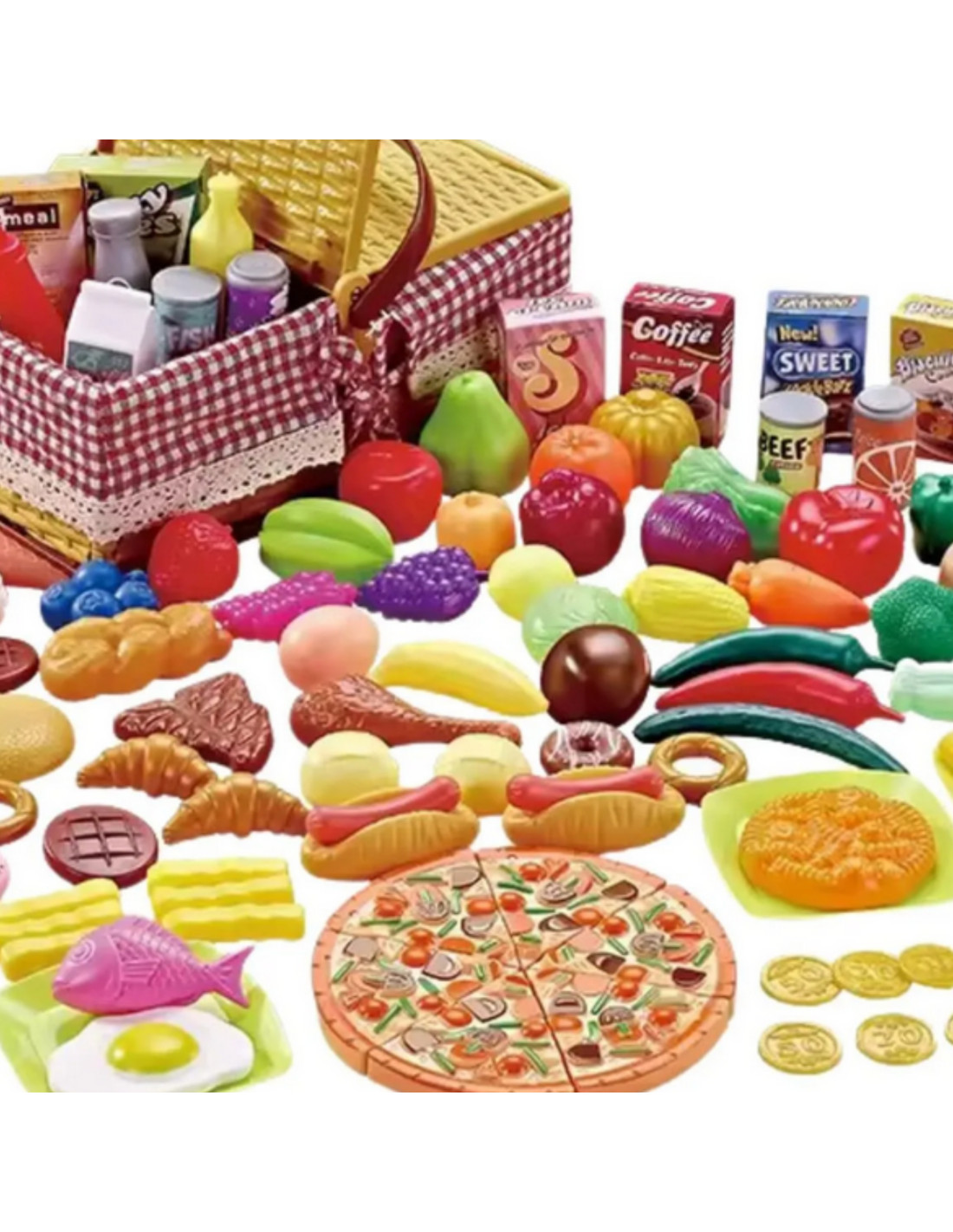 This children's picnic basket from Woopie is a real treat for little ones who love playing house, shop, or cooking! It's the perfect toy for spending time together as a family! Take the basket to the garden, patio, beach, or picnic in the park and organize a small outdoor party. Children can independently assemble the food, prepare meals for teddy bears and dolls, or treat their parents to pizza and dessert. This set introduces children to a world of role-playing, social interaction, and culinary adventures while supporting their development. Outdoor meals, even in play, teach food etiquette, sharing, and develop social awareness. With 103 realistic pieces , play becomes incredibly diverse and inspiring. The set is packaged in a charming picnic basket with a handle and a lockable lid, reminiscent of a classic wicker basket – decorated with red and white checkered pattern and lace ribbon. It's easy to assemble and disassemble , making it perfect for both home and travel. Made of durable, safe materials that meet all child safety standards, this set allows your child to play alone or with siblings and friends, learning about sharing, meal planning, and the basics of trade.