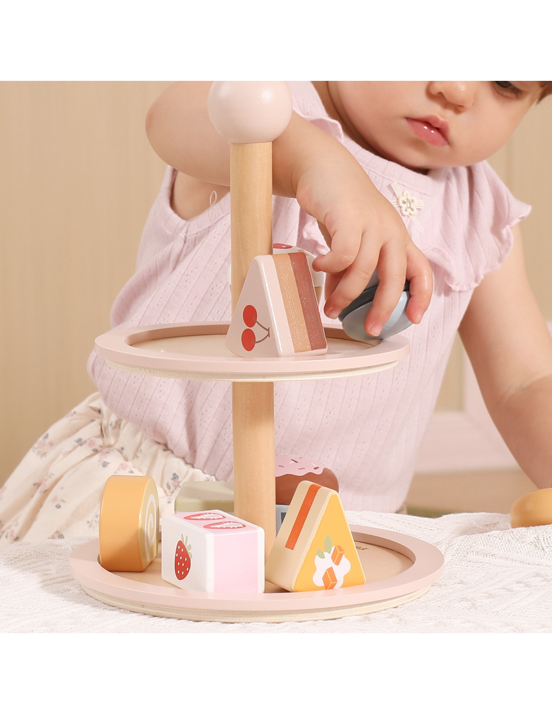 Invite your child into the world of café fun! The Viga PolarB wooden cake stand is an elegant, two-tiered cake stand filled with colorful sweets that will brighten up any afternoon tea party. The set includes 10 charming cookies and cakes, made from safe, non-toxic materials. Smooth edges and the perfect size make it easy for little hands to grasp. It's not only great fun but also a way to develop a child's imagination, creativity, and social skills.