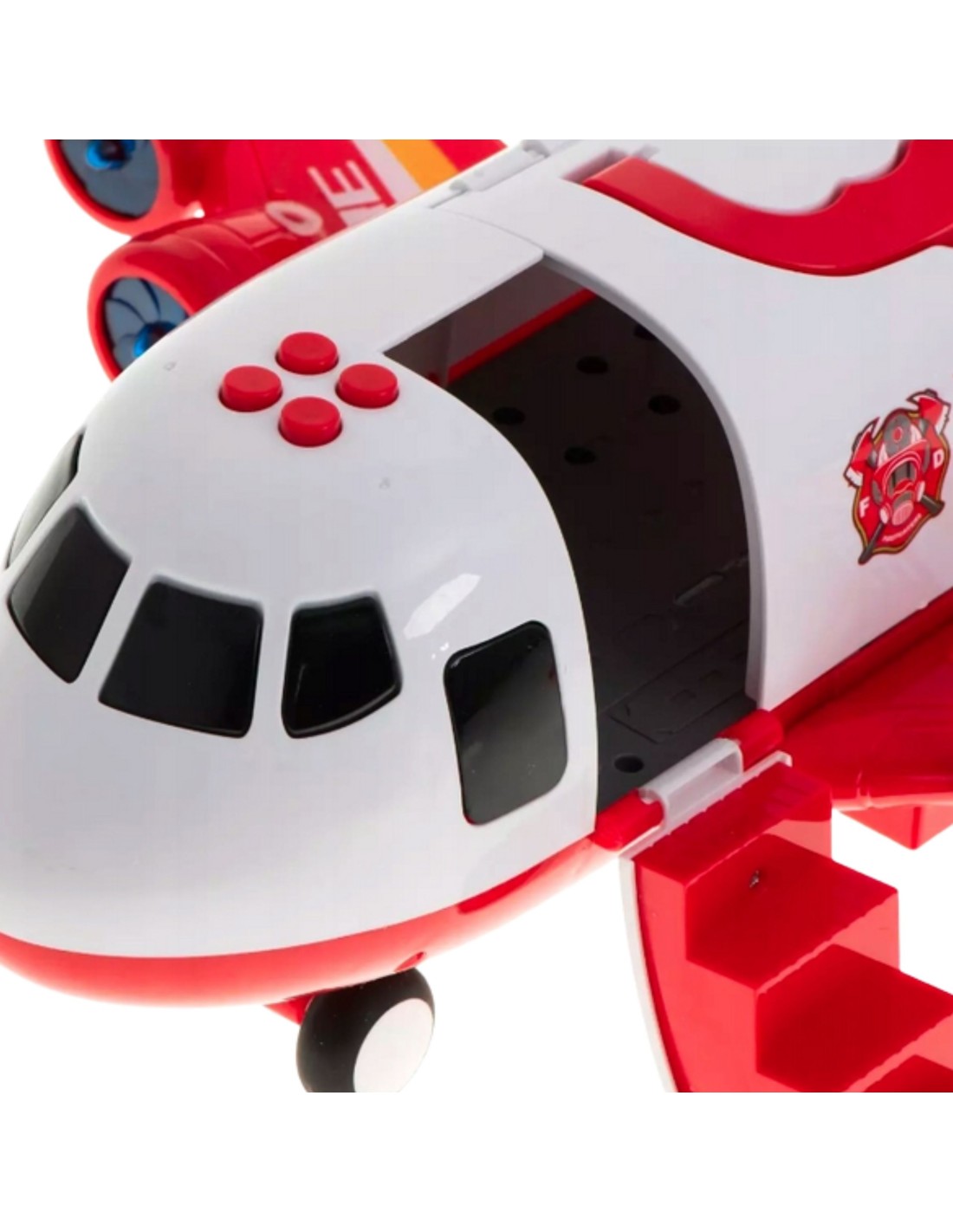 Discover the WOOPIE! Firefighter Transporter Plane , which will take your child on an exciting rescue mission! The spacious fuselage houses three fire trucks and a set of road signs, allowing for complete freedom of play. Four buttons activate realistic sounds and flashing LEDs, bringing the toy to life like real rescue equipment. Opening doors and a lowering ramp add dynamic action. This is the perfect gift for a little hero aged 3 and up, helping develop imagination and responsibility.