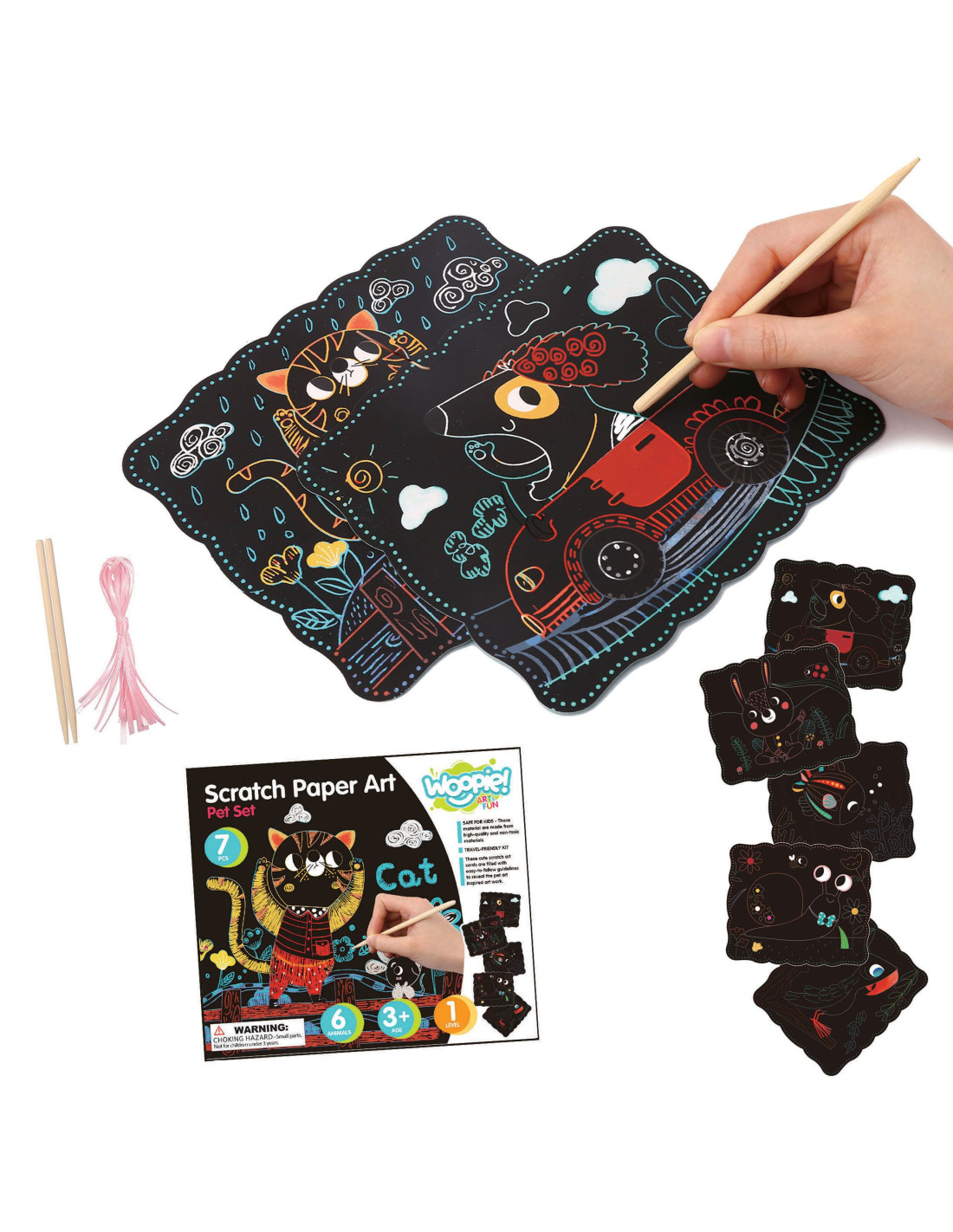 Spark your child's imagination with magical scratching boards from the WOOPIE ART&FUN series! Using a wooden stylus , your child can scratch out new shapes/patterns hidden on the board and then watch as the colors create a unique, cohesive picture with an animal motif ! The set includes 7 pieces, including 6 scratching boards and a stylus. The boards feature images of a cat , a dog , a snail , a rabbit, a fish , and a parrot . The convenient, resealable packaging allows your child to take the set anywhere . This toy develops fine motor skills and sparks creativity and imagination !