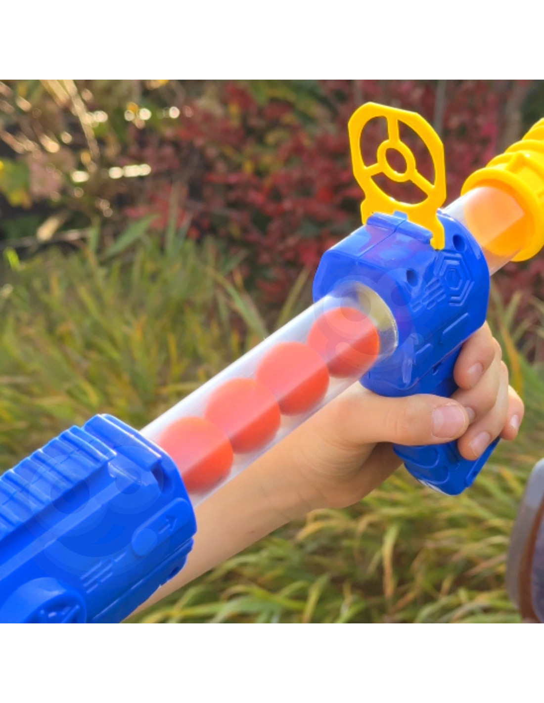 - - the gun is powered by air, so just press the stock towards yourself and then push it away, and the ball will shoot