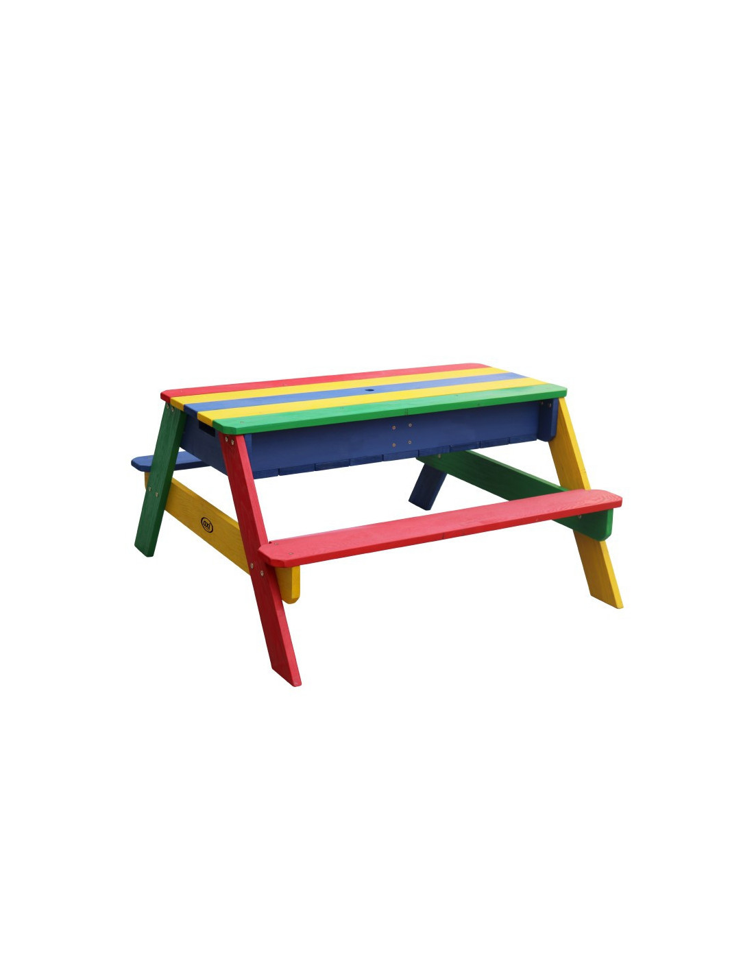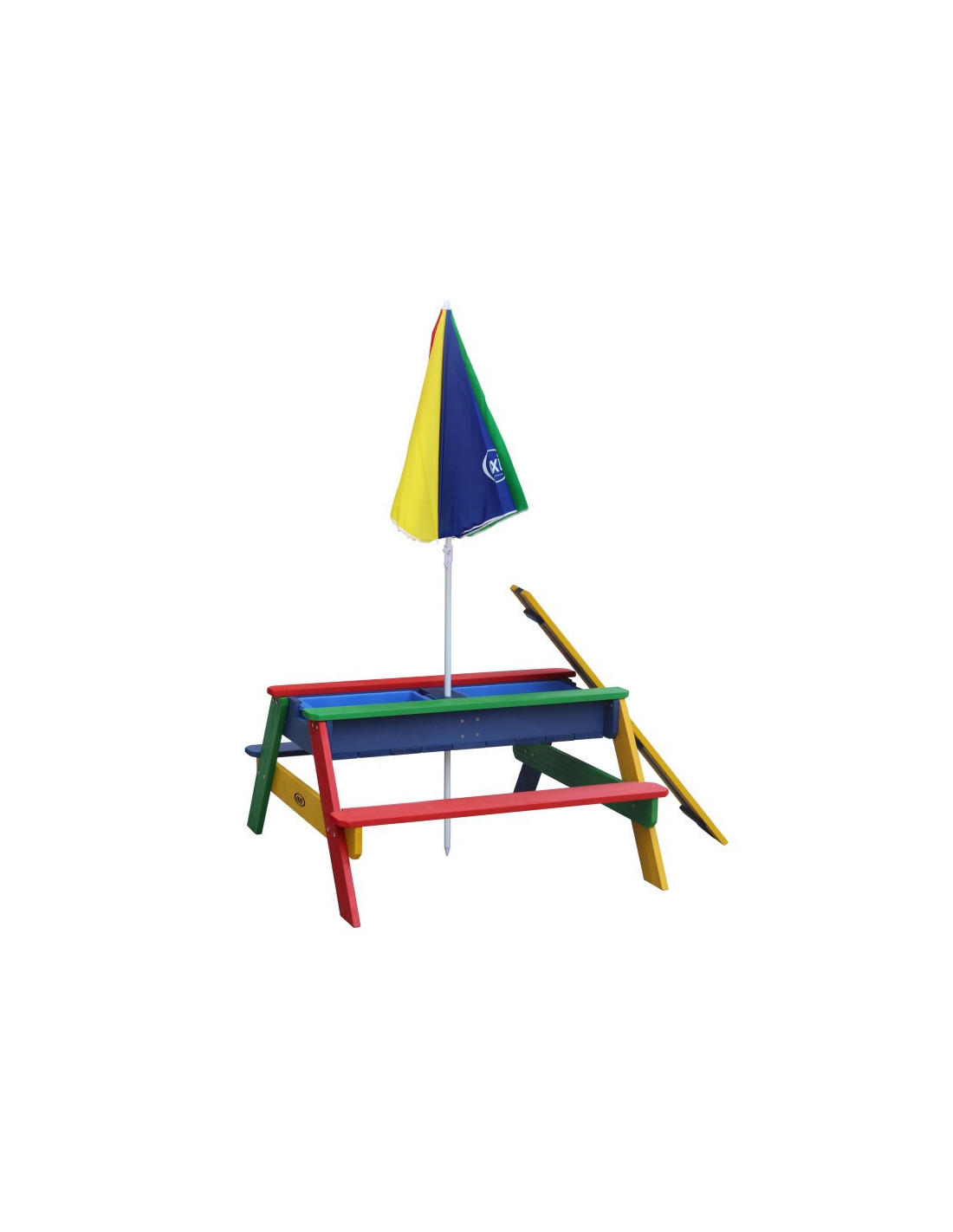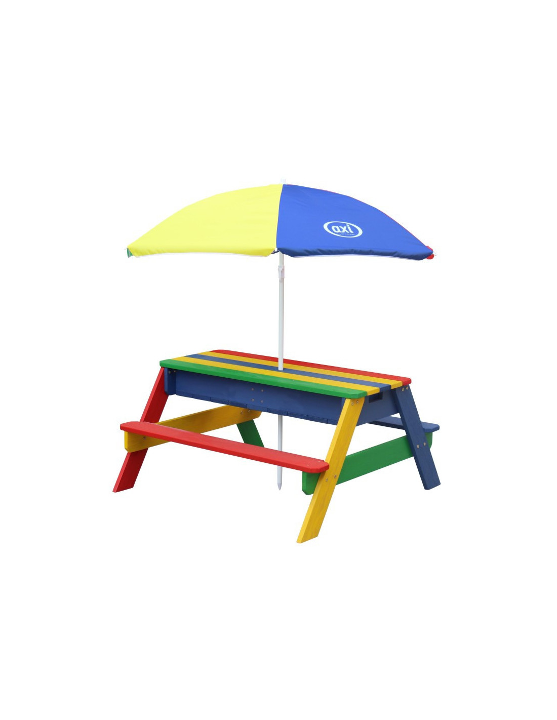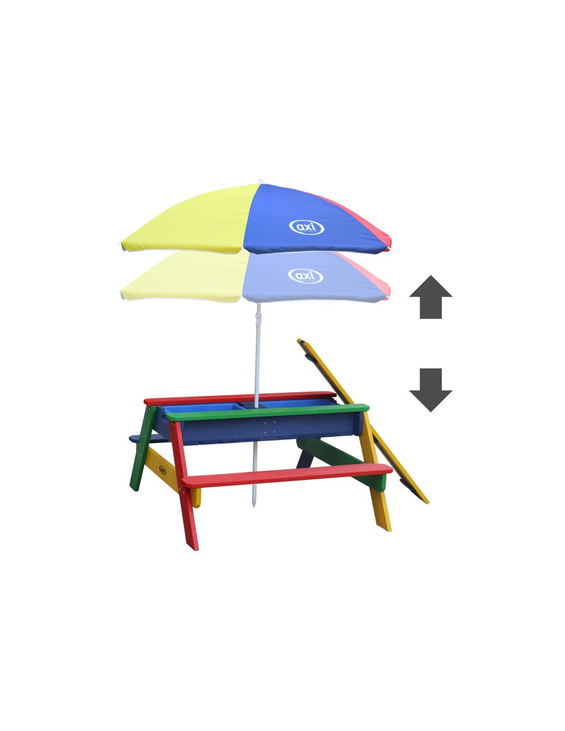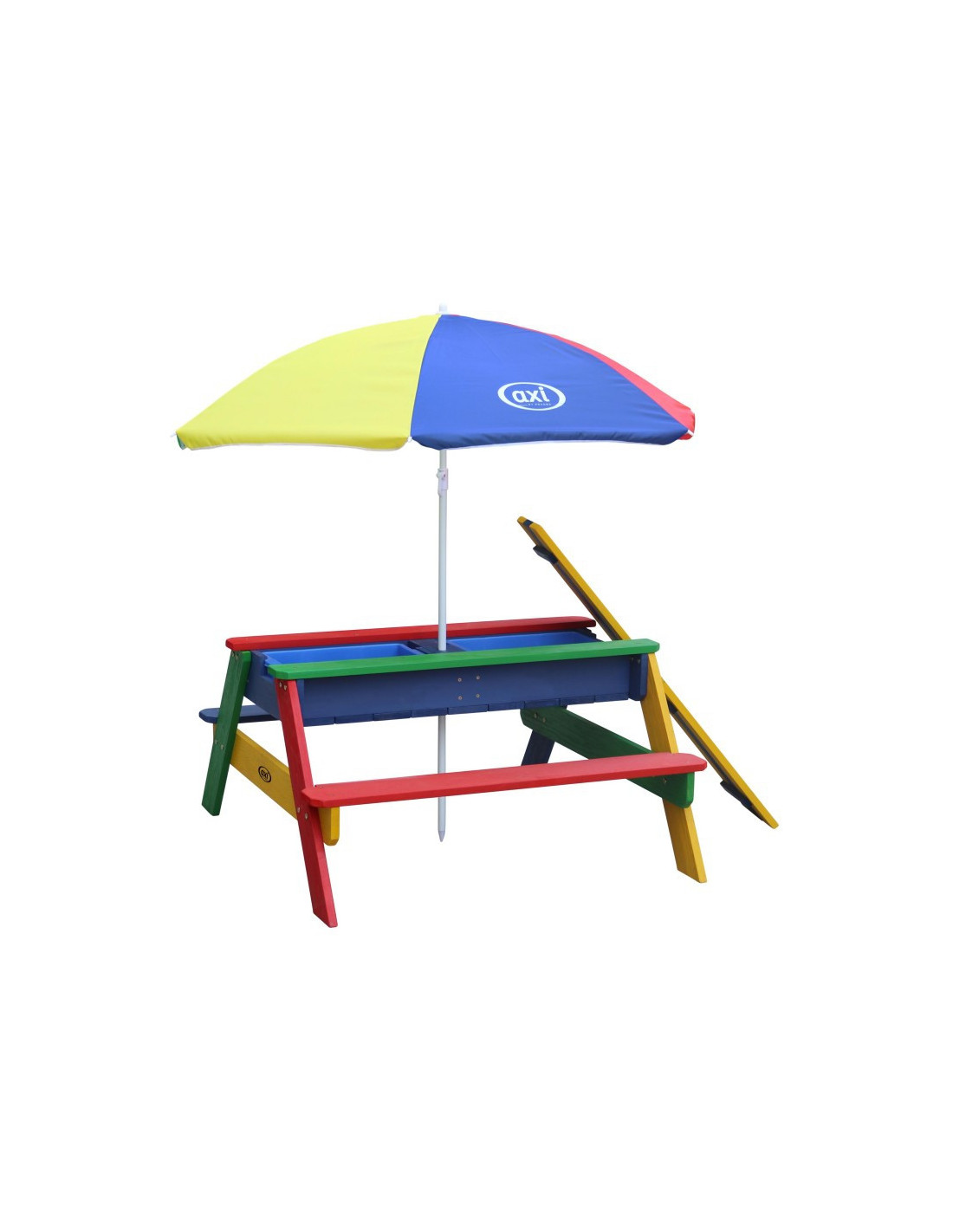 The Axi picnic bench with table will bring your children lots of joy. This multifunctional garden furniture piece transforms into a sandbox or water table by removing the tabletop. An umbrella can be attached to the table to protect children from the sun. Children love the table for its rainbow colors.