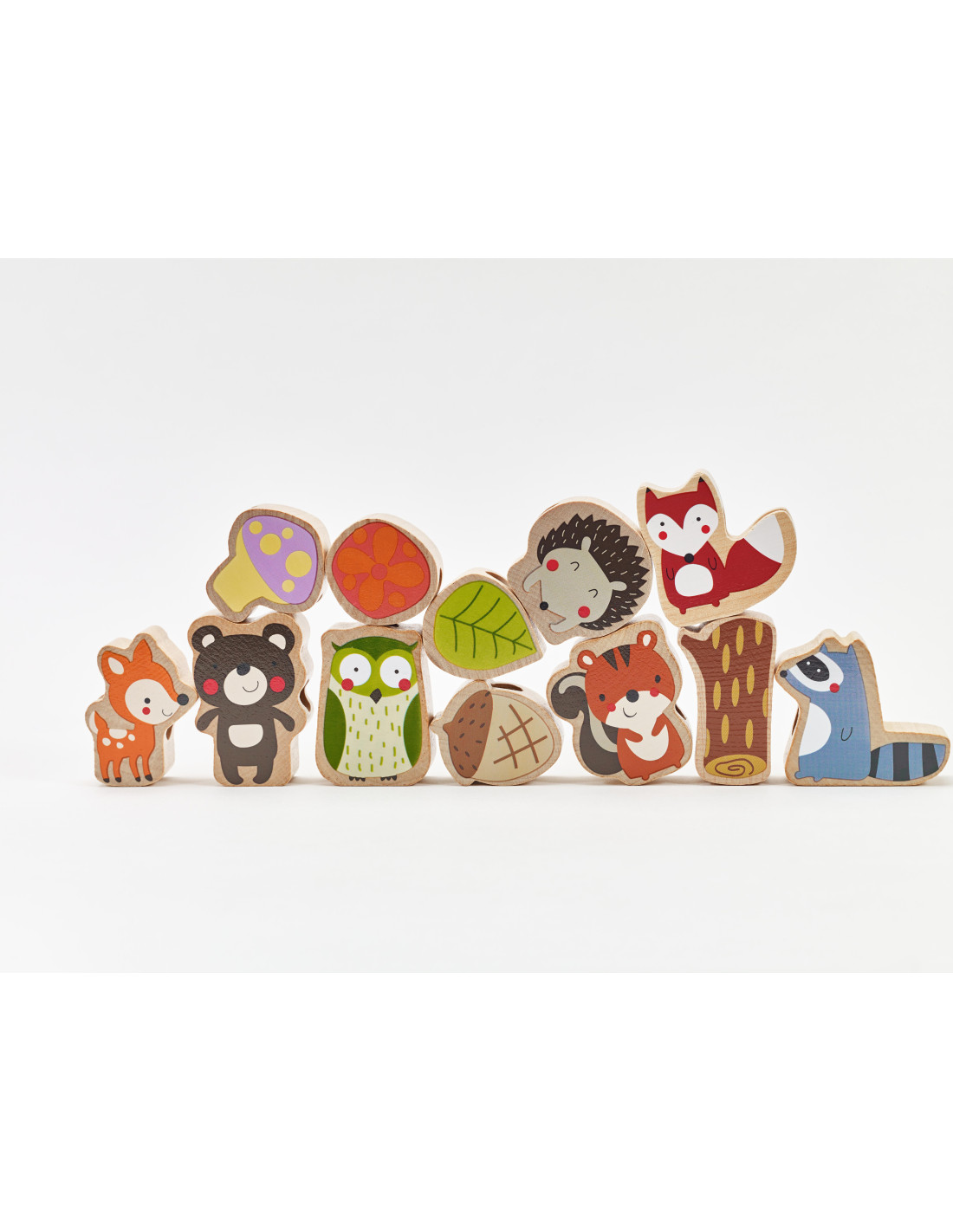 - - The set consists of a string and 12 beads depicting various forest animals and plants, including: a hedgehog, an owl, a pine cone, a leaf, and a mushroom.