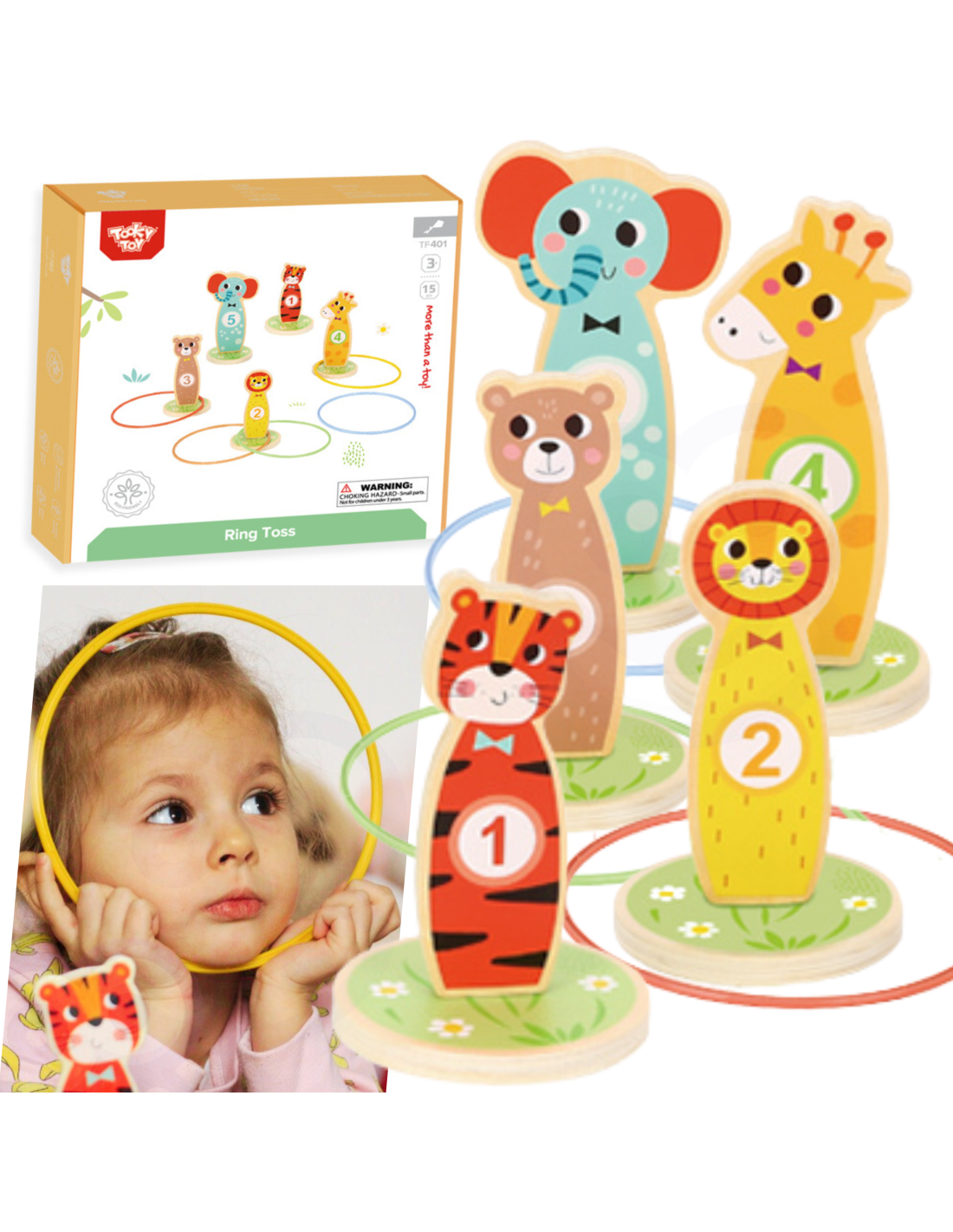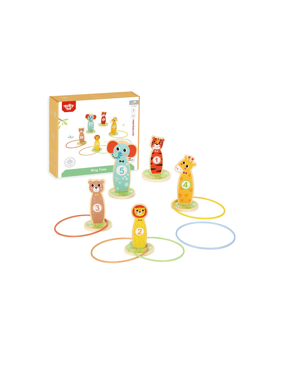 Tooky Toy Wooden Throwing Target Skill Game - This fun skill game is perfect for kids. As the game progresses, you can increase the difficulty by placing the pegs further apart. The set includes 5 adorable animal-shaped pegs on wheels and 5 throwing rings . Suitable for indoor and outdoor play, it can be played alone or with friends.