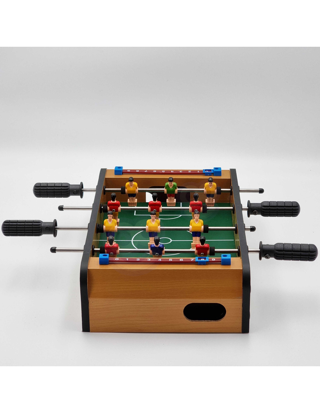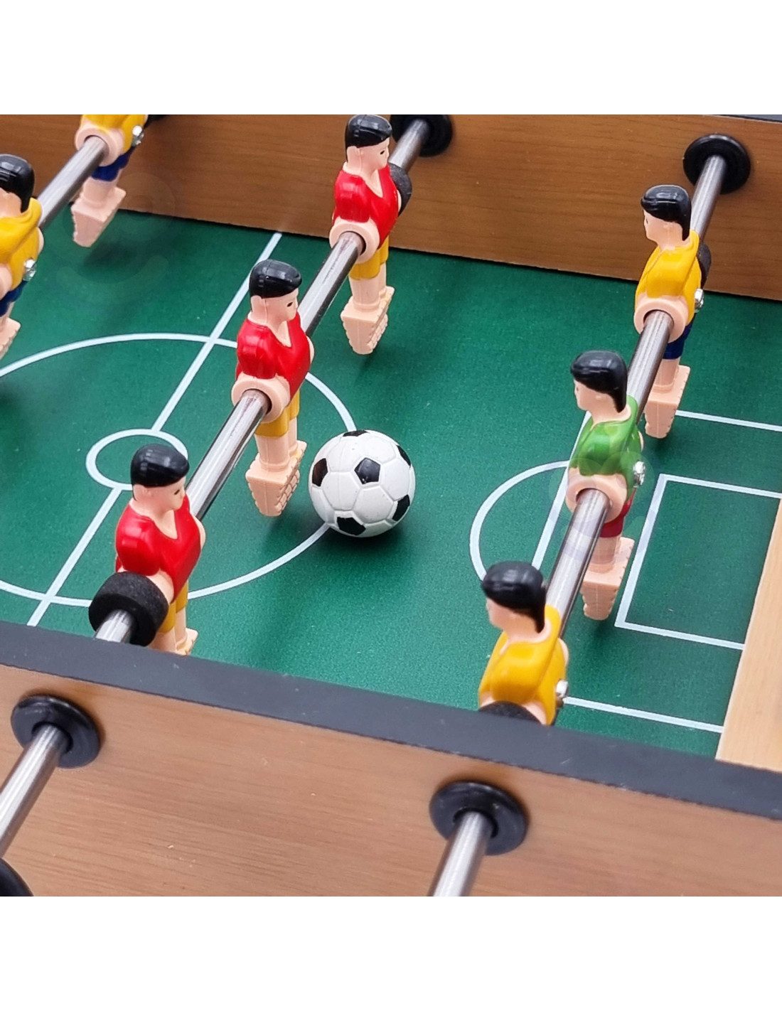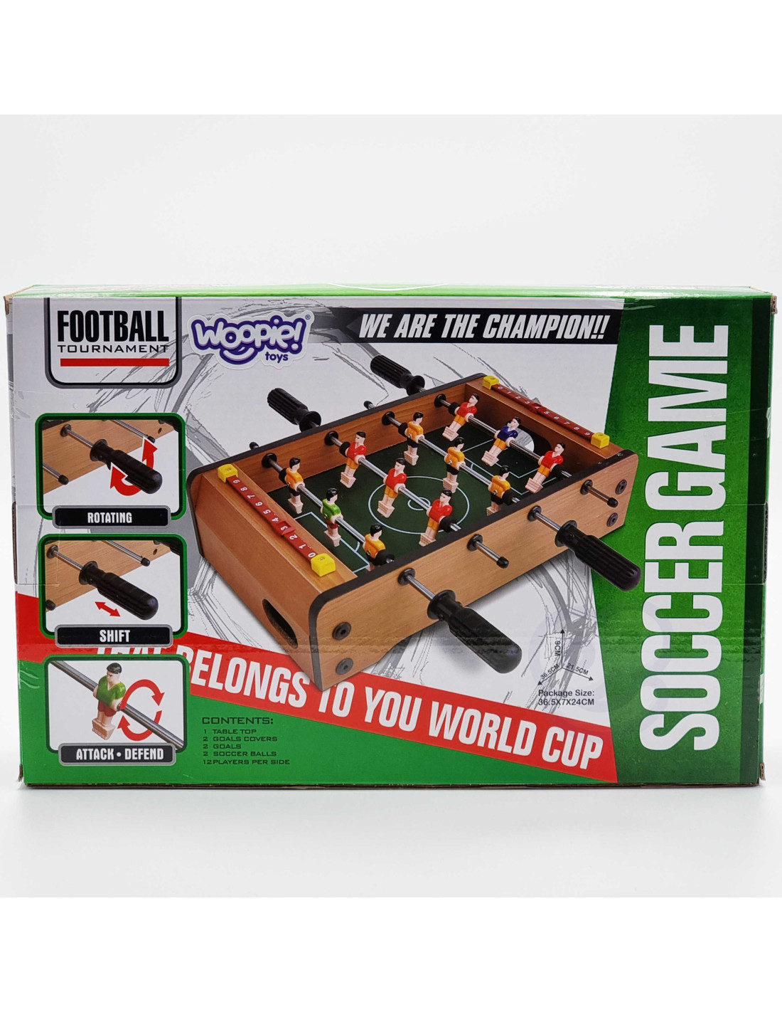 The Woopie foosball table will keep your little one occupied for hours . This game is designed for two players . Each runner features three players, who play aggressively on the pitch. The entire set comes packaged in a beautiful and neat box . A convenient handle allows for easy carrying of the box and its contents. Suitable for children aged 6 and up.