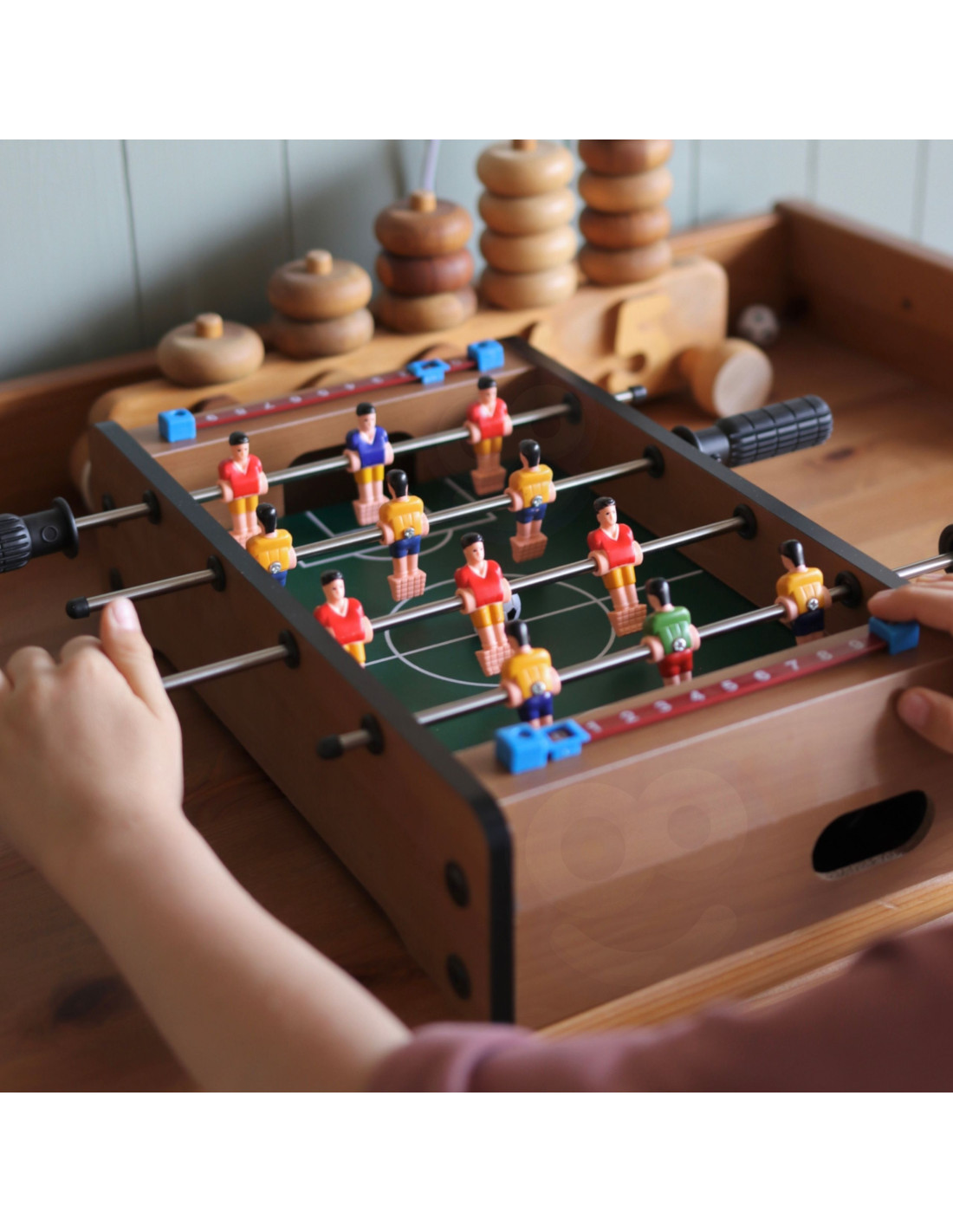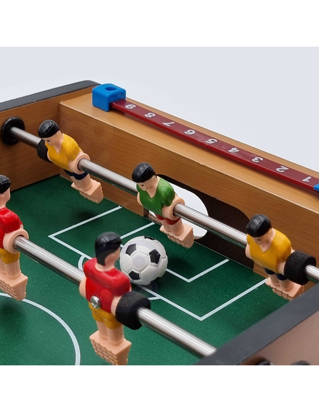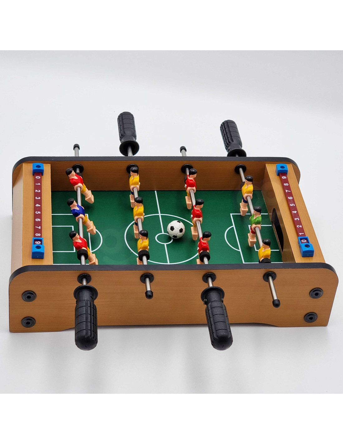 The Woopie foosball table will keep your little one occupied for hours . This game is designed for two players . Each runner features three players, who play aggressively on the pitch. The entire set comes packaged in a beautiful and neat box . A convenient handle allows for easy carrying of the box and its contents. Suitable for children aged 6 and up.