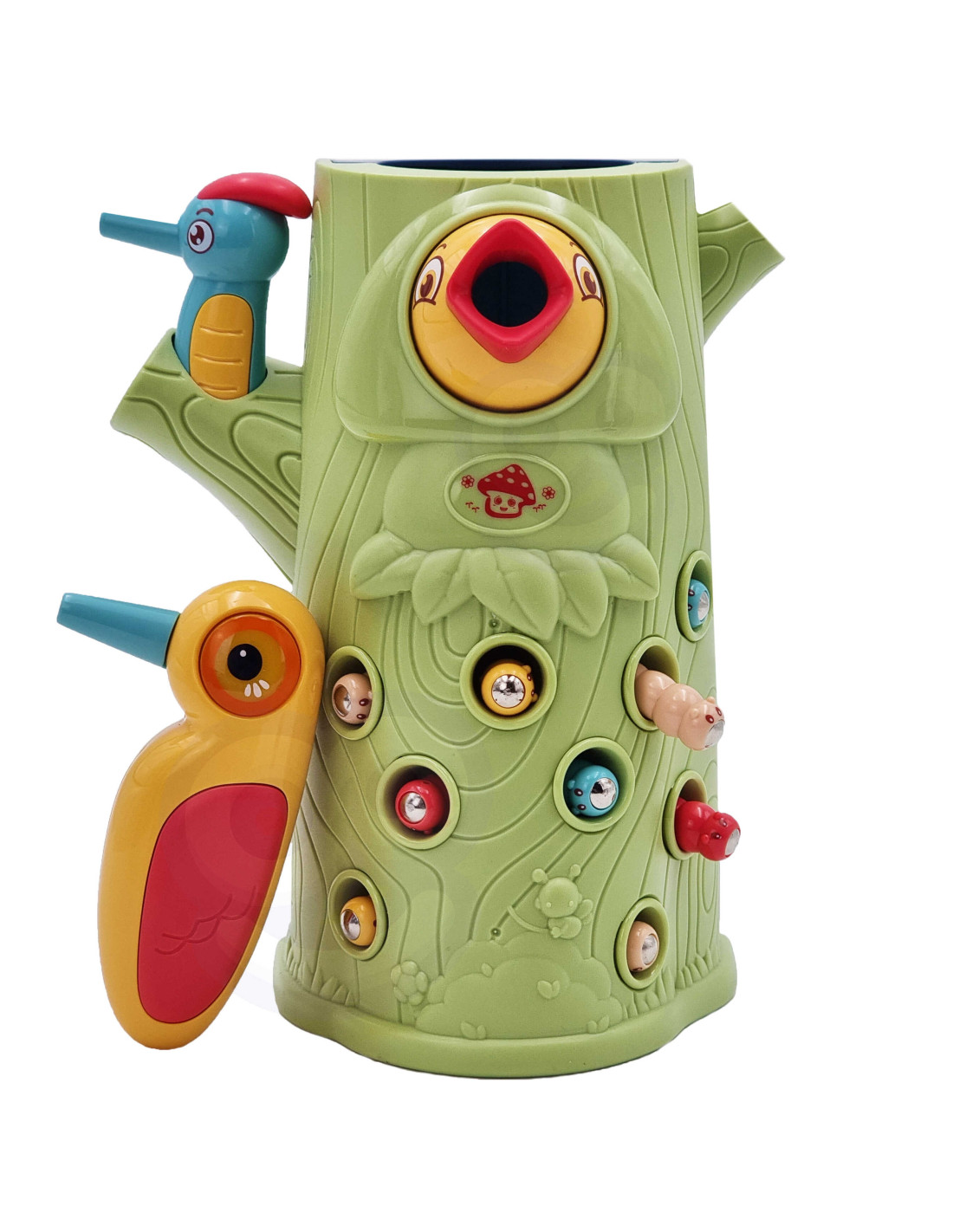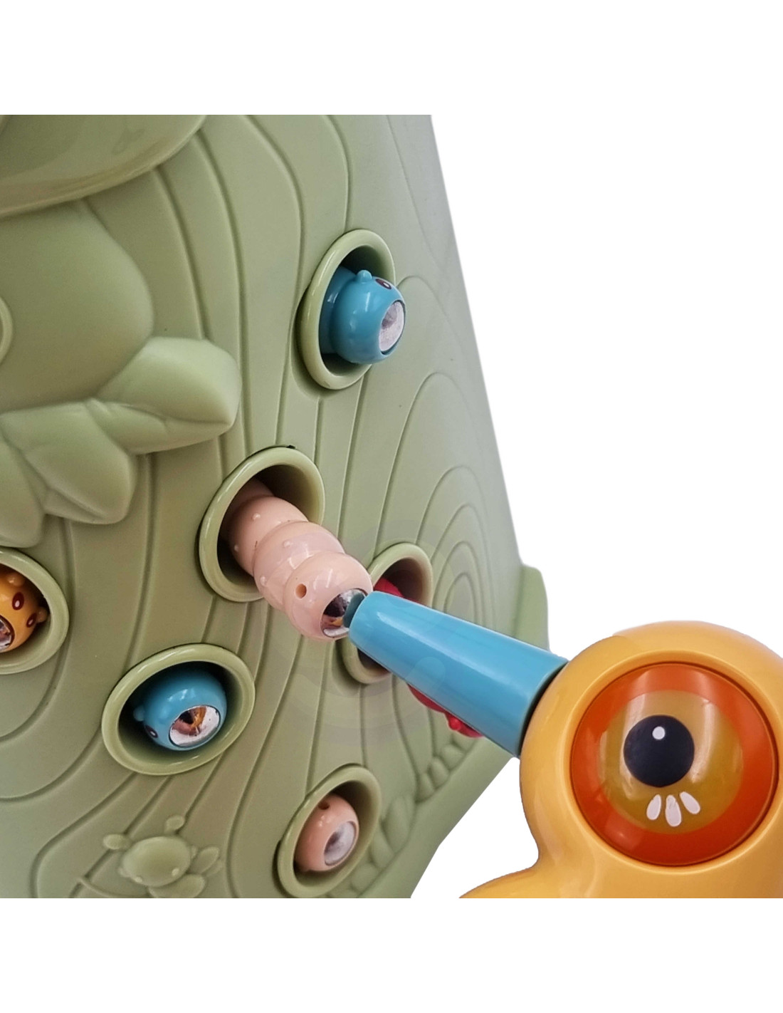 The WOOPIE Catch the Bug Skill Game is a great way to spend time with your child. Simple rules and intuitive operation make it accessible to virtually anyone . The game involves catching bugs hidden in holes in the tree with a magnet-tipped woodpecker, then placing them back into the bird's beak . In addition to two woodpeckers for feeding the chick and a log with the chick, the set includes nine bugs. The larger woodpecker has additional features : it lights up, moves its beak, and makes sounds and a melody. Simply press the stem and the woodpecker's eye lights up, playing a lively melody. The bird can also move its beak down, and its eye lights up with a chirping sound . Two children can play with the set simultaneously . The game teaches through play and helps develop fine motor (movement) and visual skills , among other things. The toy is quite a challenge for a toddler, it requires concentration and manual dexterity, but it will also be extremely interesting for the child.