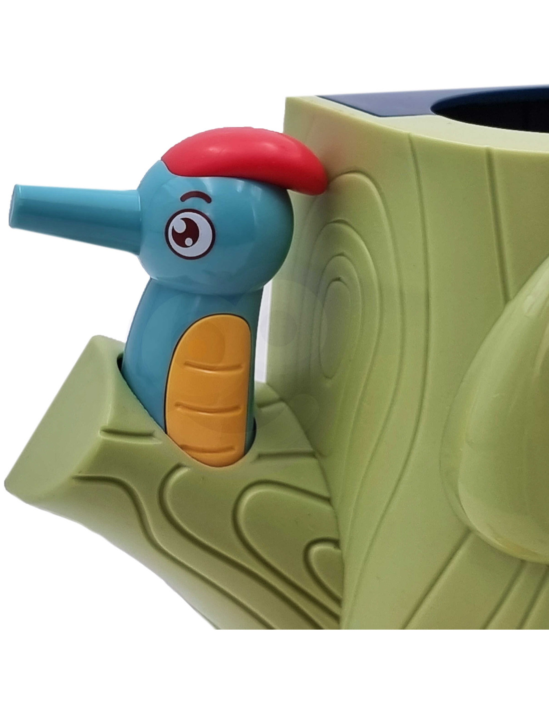 - - the woodpecker lights up , moves its beak and makes sounds and melodies,