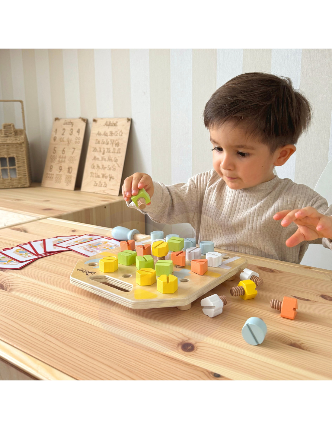 Children develop coordination , concentration , and wrist and hand strength through screwing. Test cards with ready-made patterns enrich the gameplay. Children can also play with their parents to memorize the patterns they create. Toddlers can improve their ability to recognize and distinguish colors and shapes and strengthen their fine motor skills .