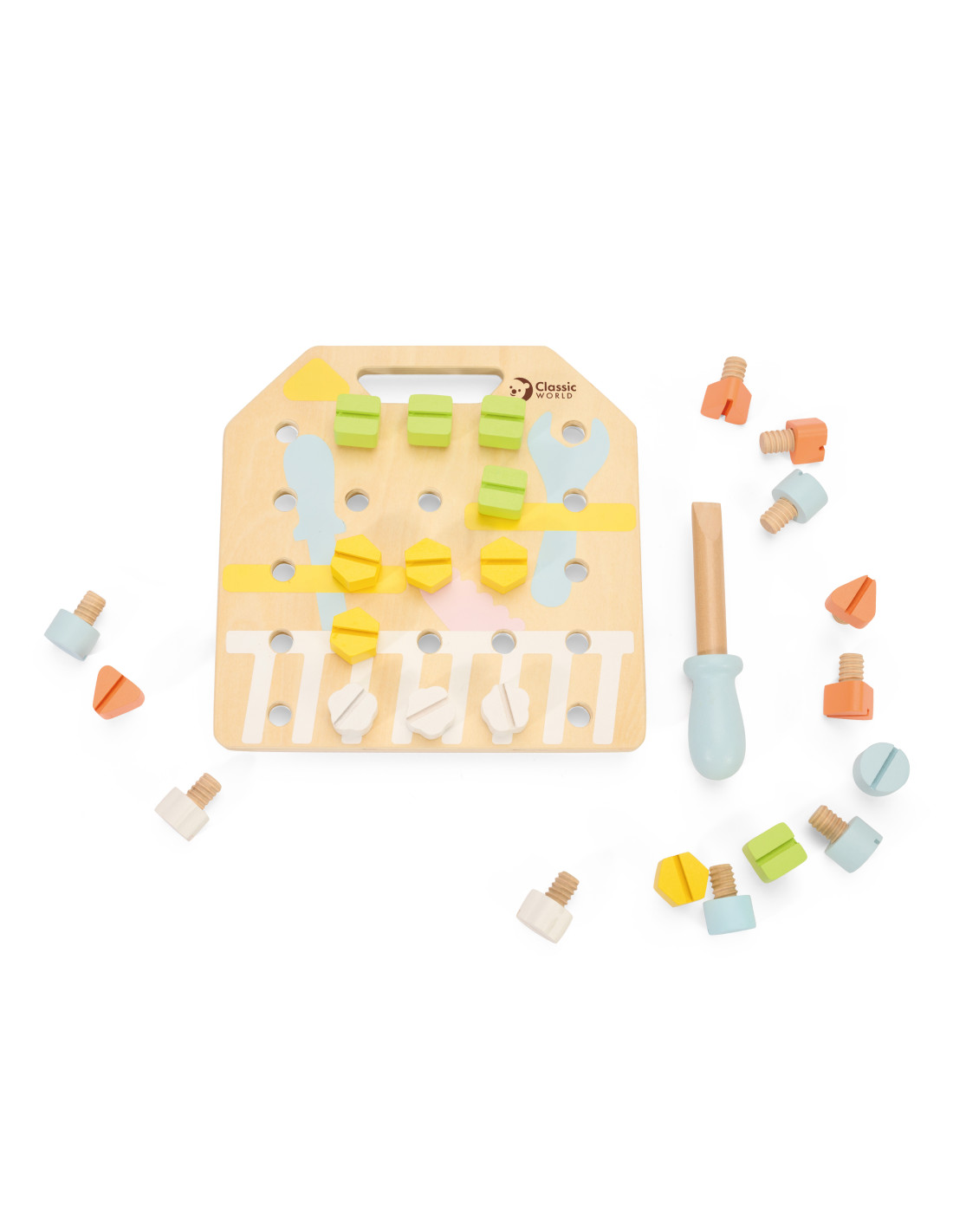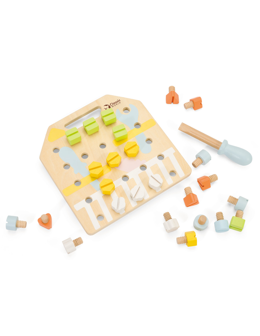 The wooden screw board from CLASSIC WORLD is a toy designed to support children's development through play. The game involves screwing screws into the board, creating various shapes. The set includes, among other things, cards with patterns that the child can create in a game, e.g. "by heart" together with a parent.