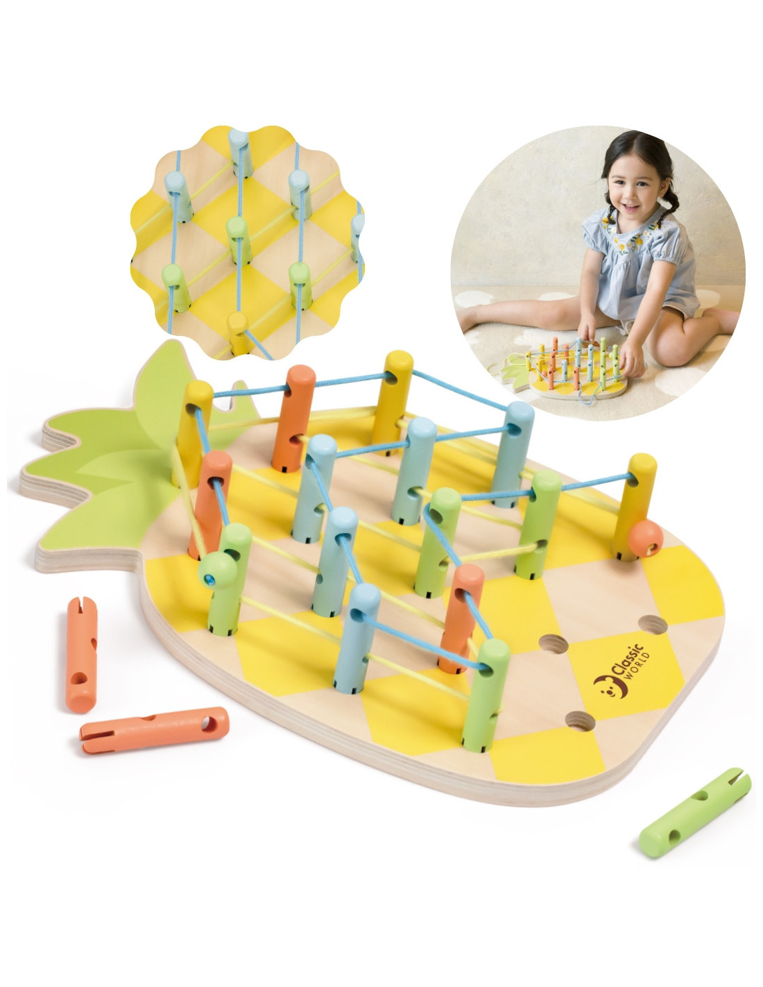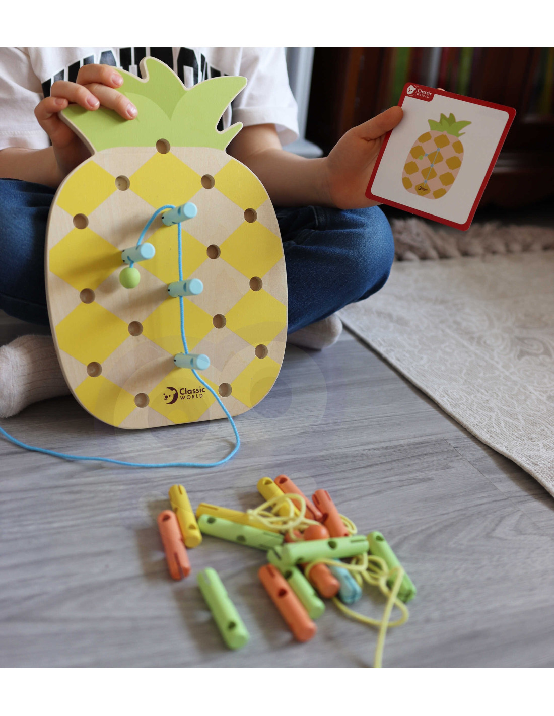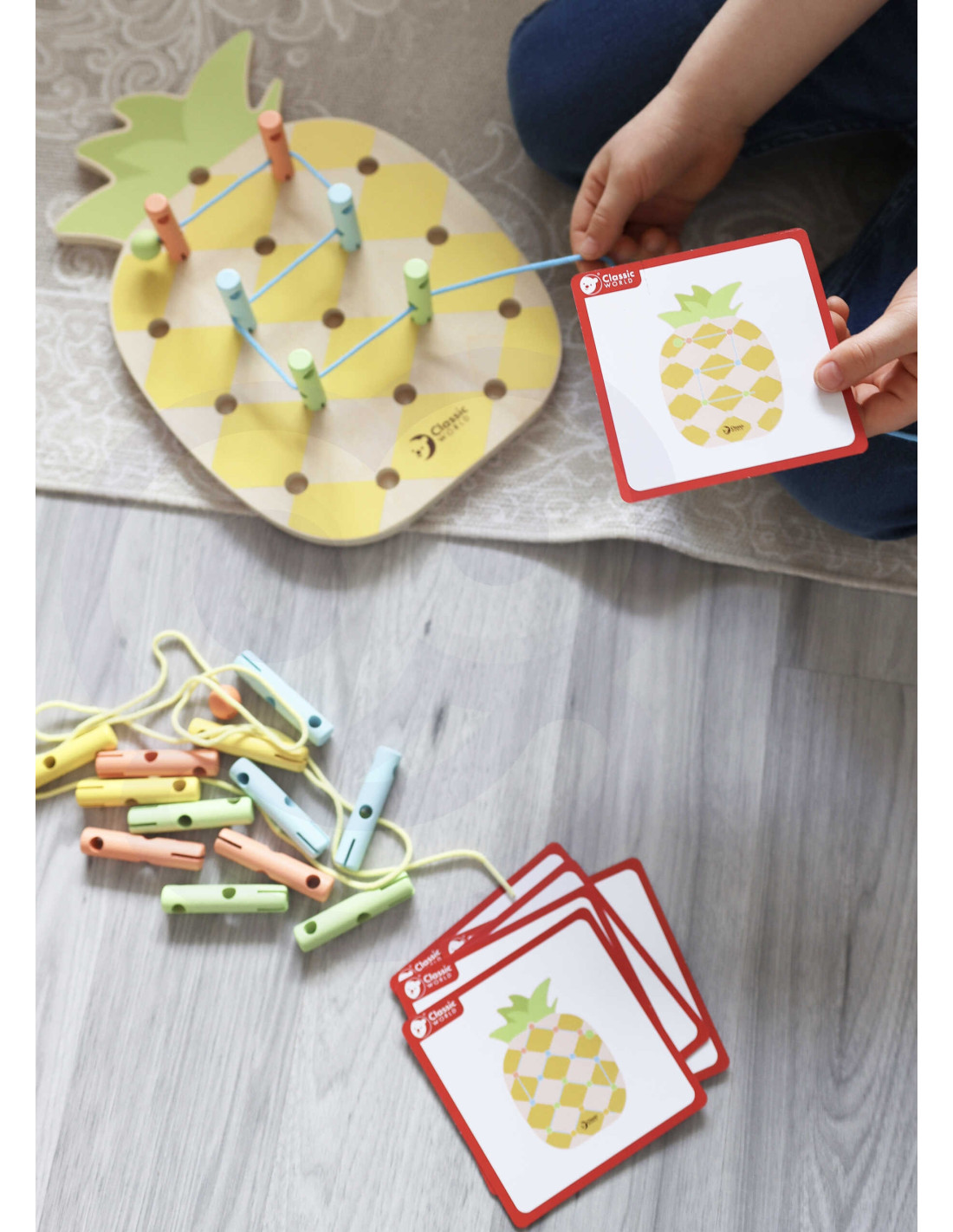 The Wooden Pineapple Threading Toy from Classic World is a classic set of colorful pegs with holes through which the child threads a string. The pegs can be arranged in any pattern imaginable , which will positively impact your toddler's creativity and further stimulate their imagination. This toy will provide hours of fun for your child while also developing their focus and concentration. Each piece is made of high-quality wood and painted with non-toxic paint , making the product completely safe for children.