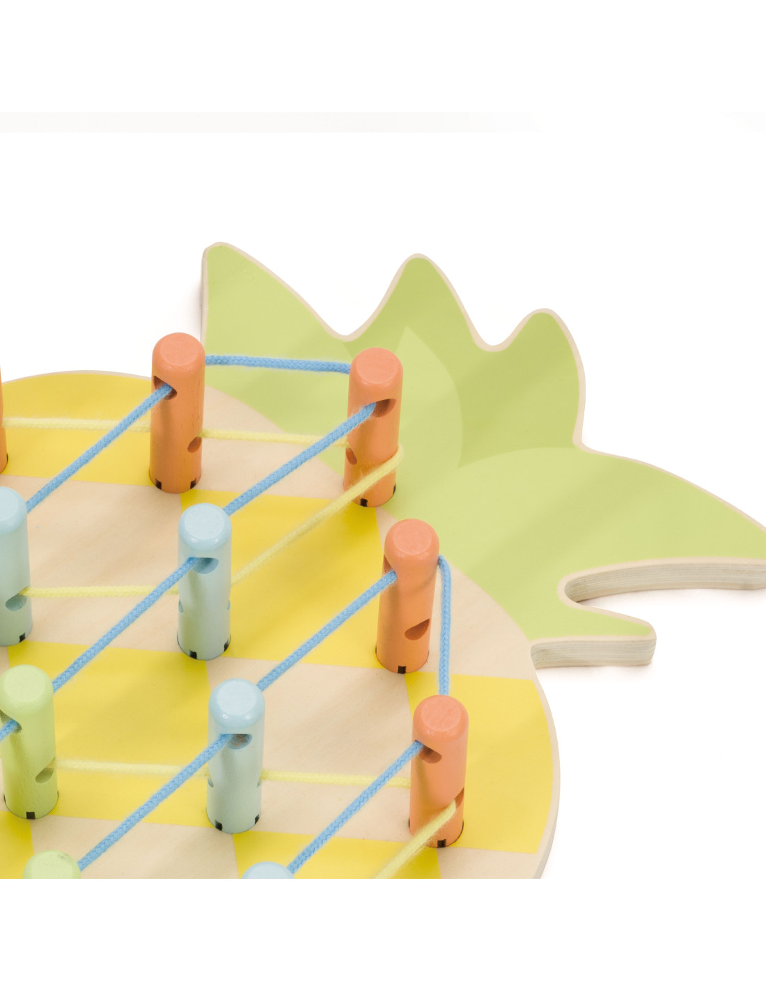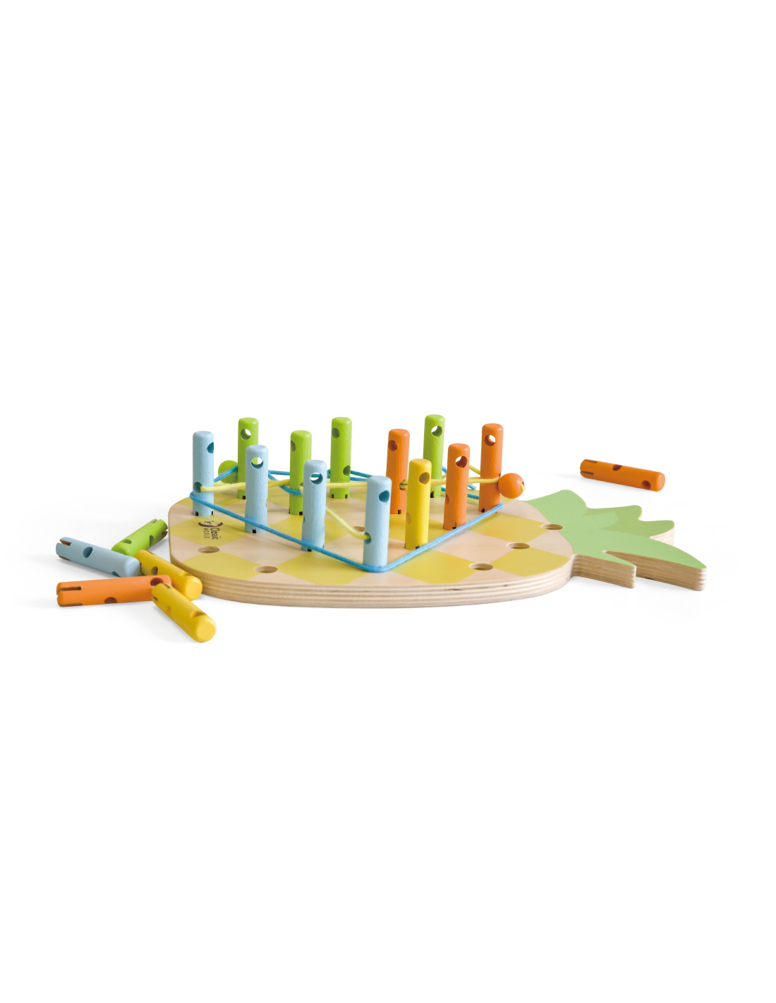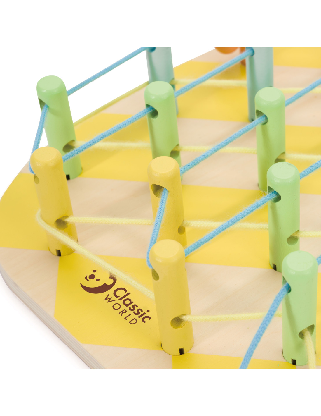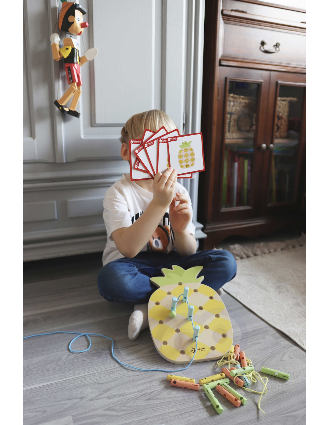 The Wooden Pineapple Threading Toy from Classic World is a classic set of colorful pegs with holes through which the child threads a string. The pegs can be arranged in any pattern imaginable , which will positively impact your toddler's creativity and further stimulate their imagination. This toy will provide hours of fun for your child while also developing their focus and concentration. Each piece is made of high-quality wood and painted with non-toxic paint , making the product completely safe for children.