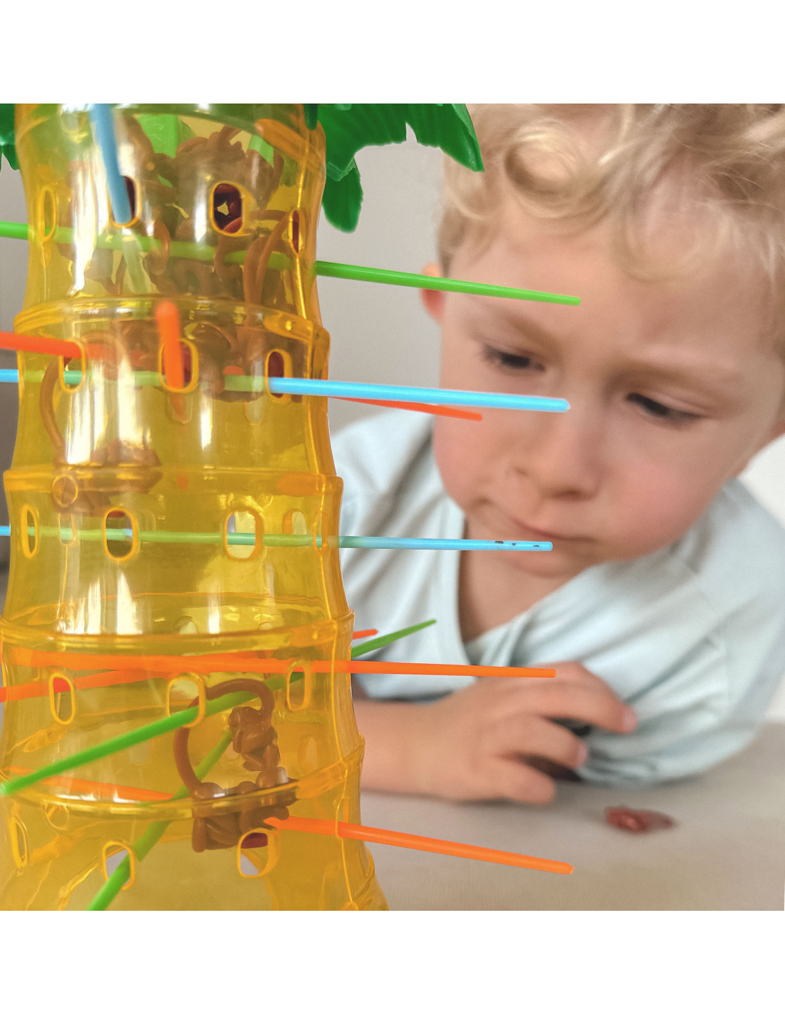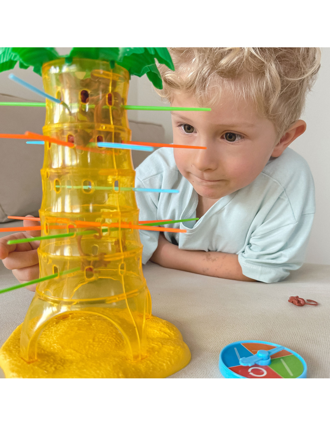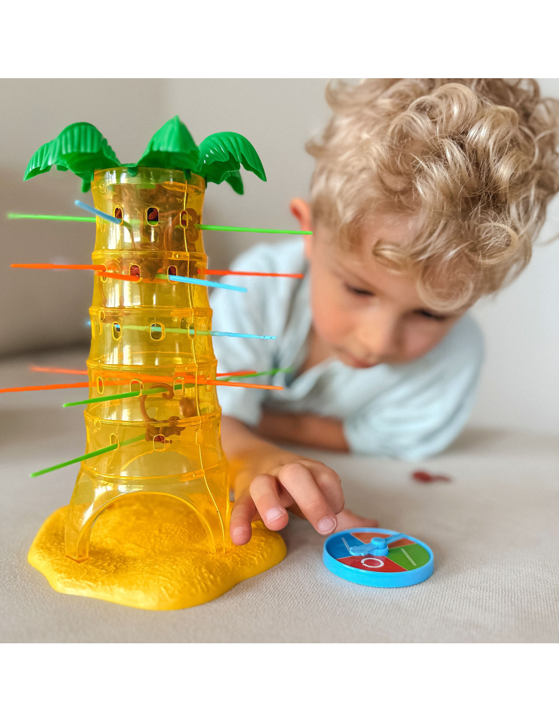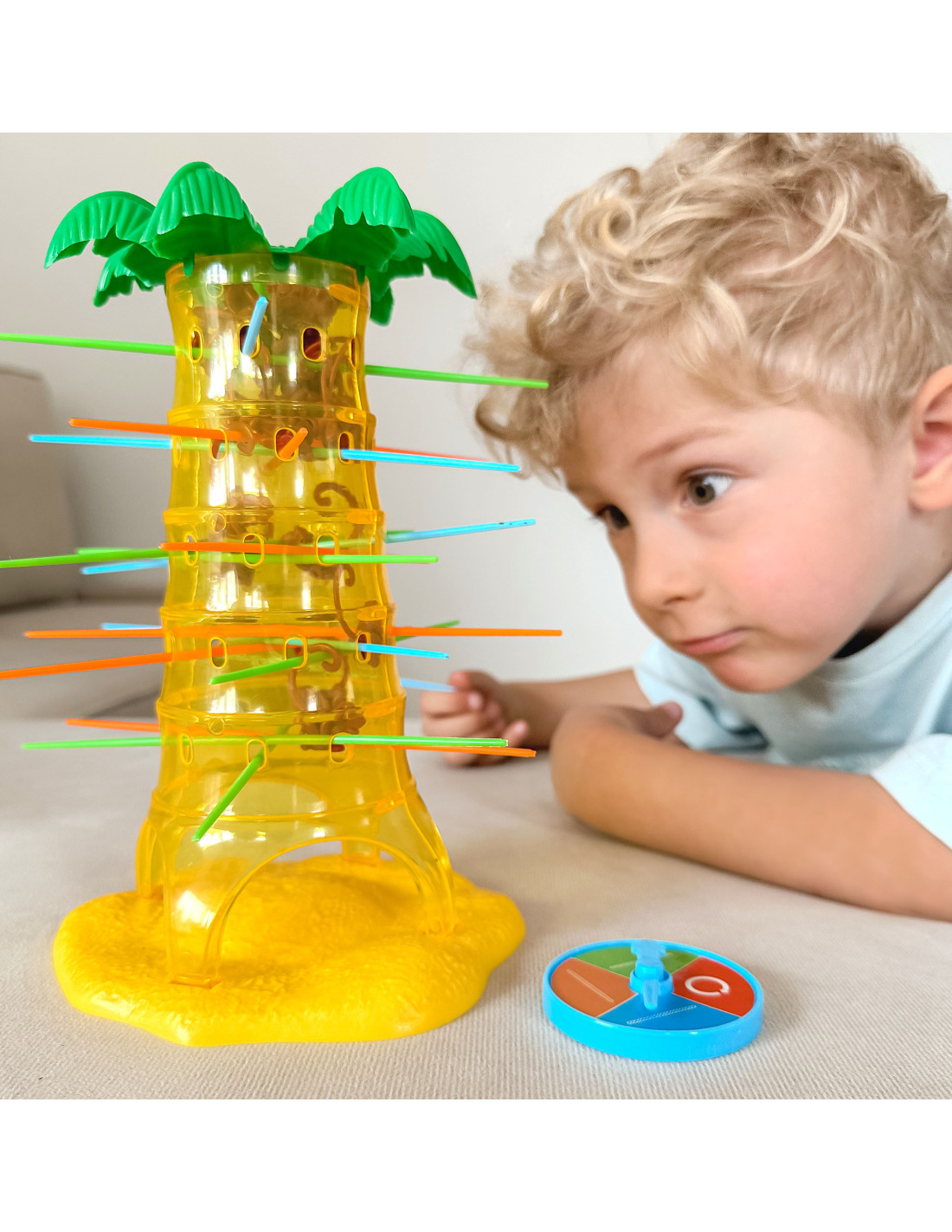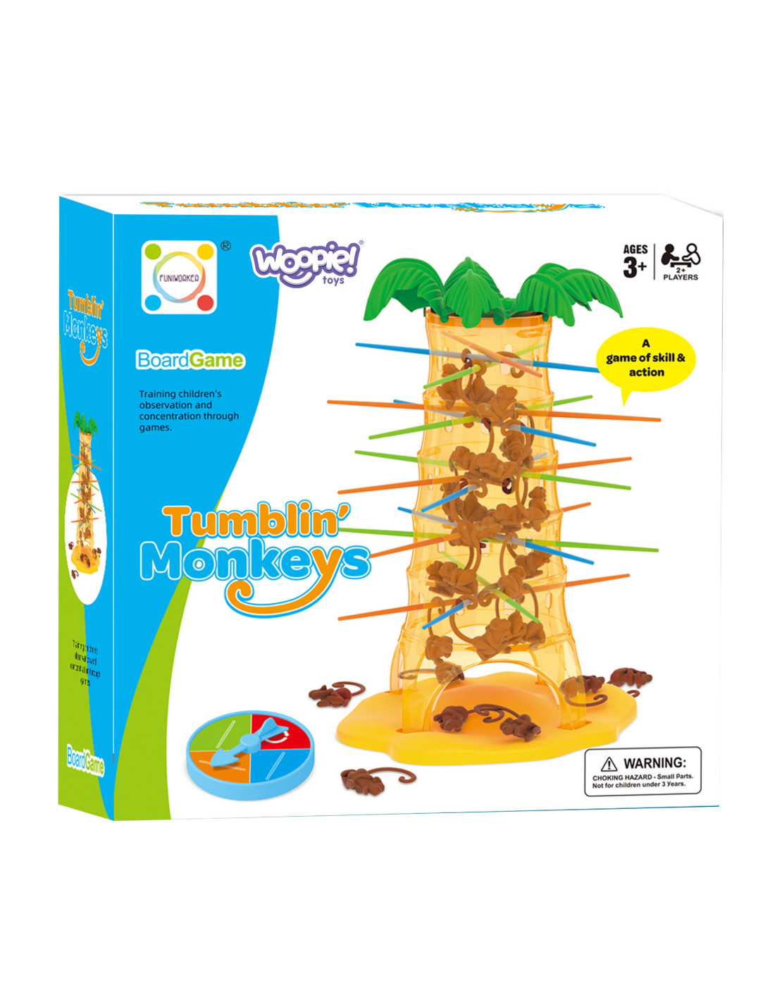 The Falling Monkeys game from Woopie is a great game for the whole family, improving dexterity and keeping the players on edge . Place sticks in the palm tree's holes and then toss the monkeys inside. Spin the wheel; the arrow will show you which color stick you need to pull out so that as few monkeys as possible fall from the palm tree. The winner is the player who knocks the fewest monkeys out of the tree. Play and don't let the monkeys fall from the palm tree.