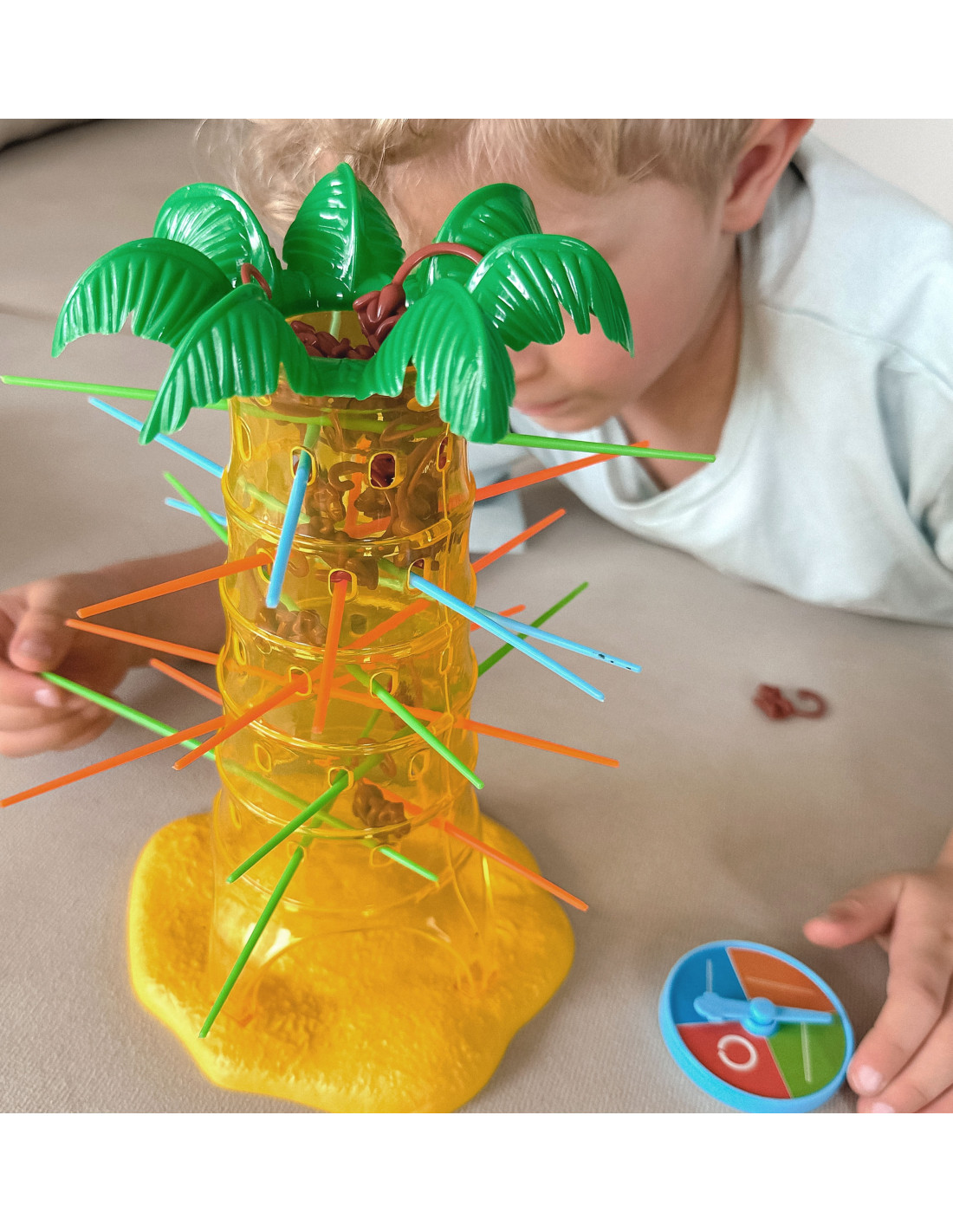 - - the set includes: a palm tree with holes, a colored wheel with an arrow, 18 sticks, 20 monkeys, instructions