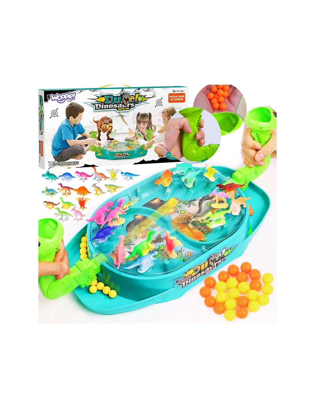 Dinosaur Battle is an arcade game from the Woopie brand. This two-player dinosaur shooter will significantly improve coordination skills . Place the dinosaurs on the board in the appropriate spots. Drop the balls into the holder and pull the trigger to knock the dinosaurs off. The player who knocks the dinosaurs off the opponent's board the fastest wins. The set includes a game board with a plastic cover that prevents the balls from falling out, 16 colorful dinosaurs, and 24 balls in two colors.