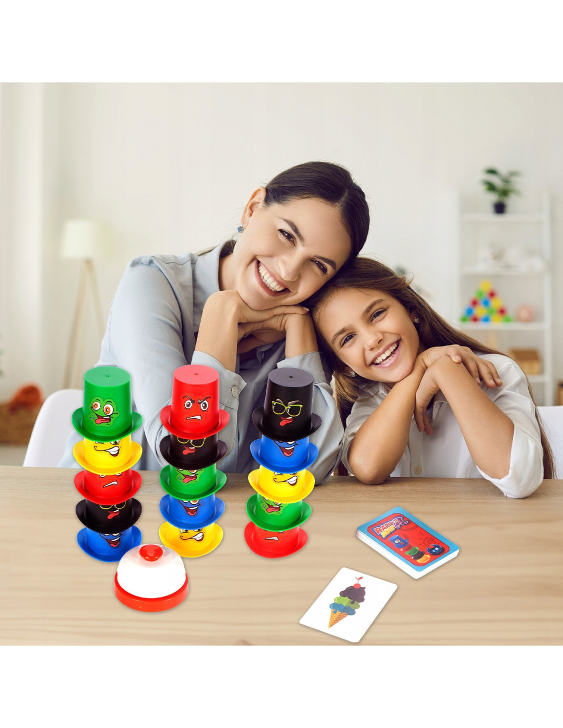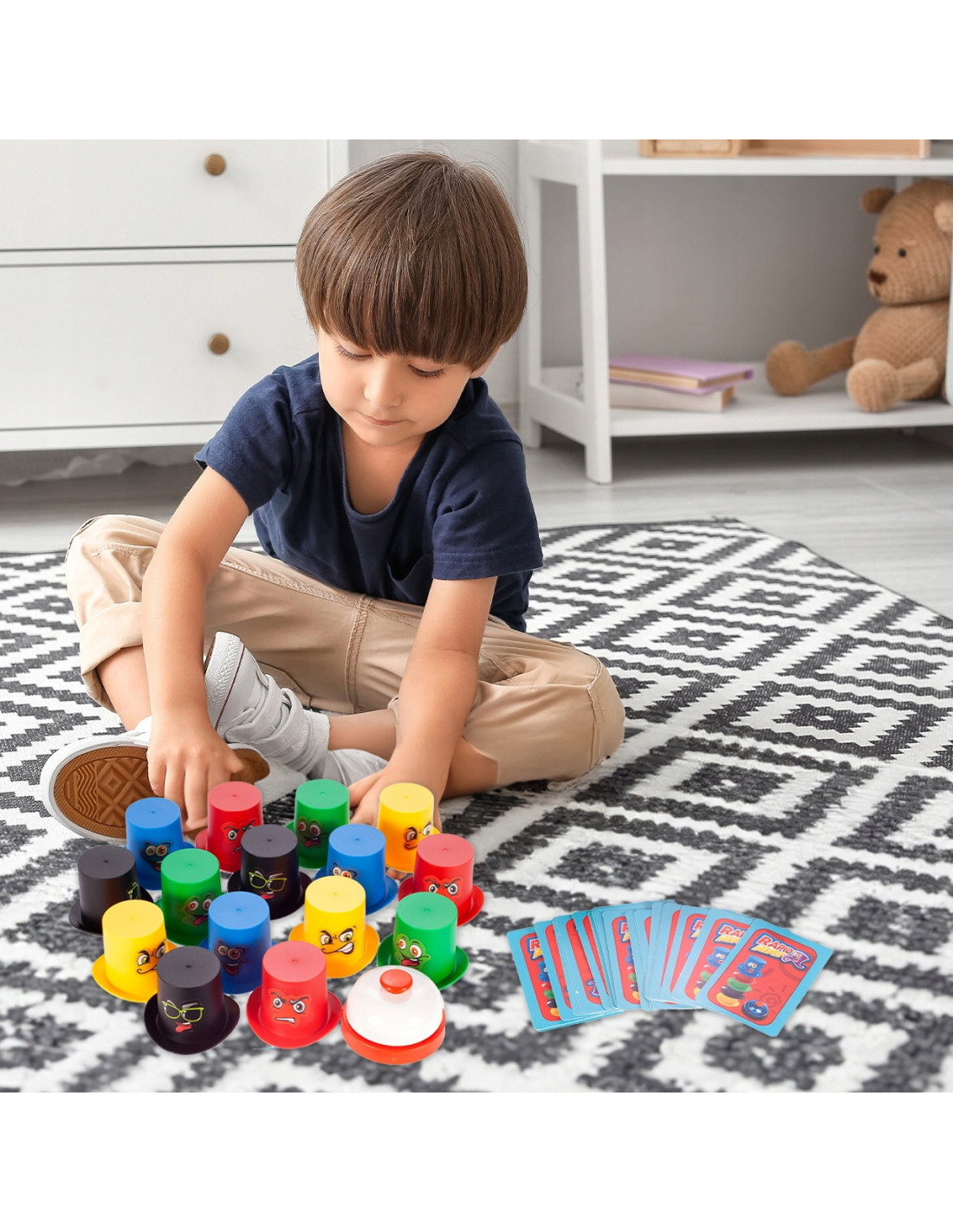 Each player receives five differently colored cups and must quickly arrange them in the order shown on the card. This indicates whether the cups should be placed side by side or stacked. Job done? Time to ring the bell as quickly as possible! The most observant player will be the winner. The game can be played by 2 to 4 players.