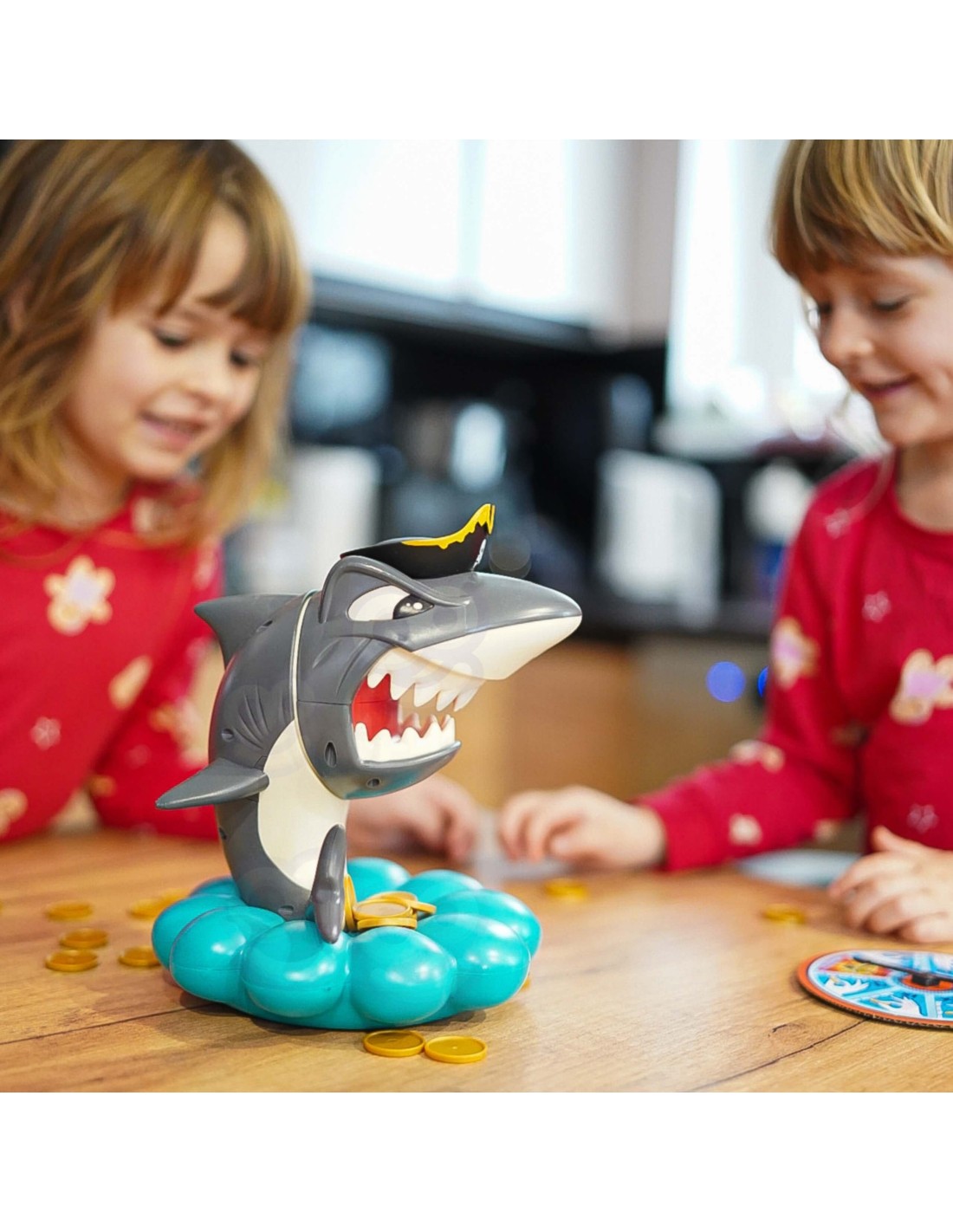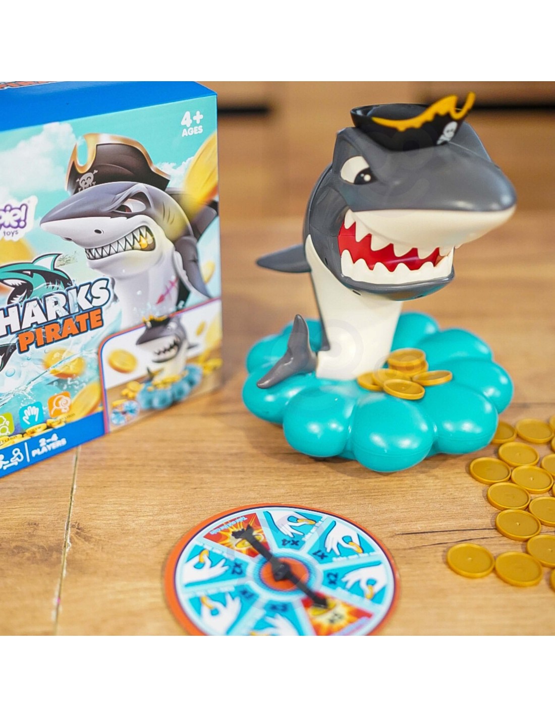 We pour all the gold coins into the shark's shell. Players take turns drawing the number of gold coins to be drawn on the wheel with the arrow. Then, according to the drawn option, they try to draw them from the shark's shell. The shark is very alert and could simply shoot at any moment. When this happens, the player whose turn it was that shot loses.