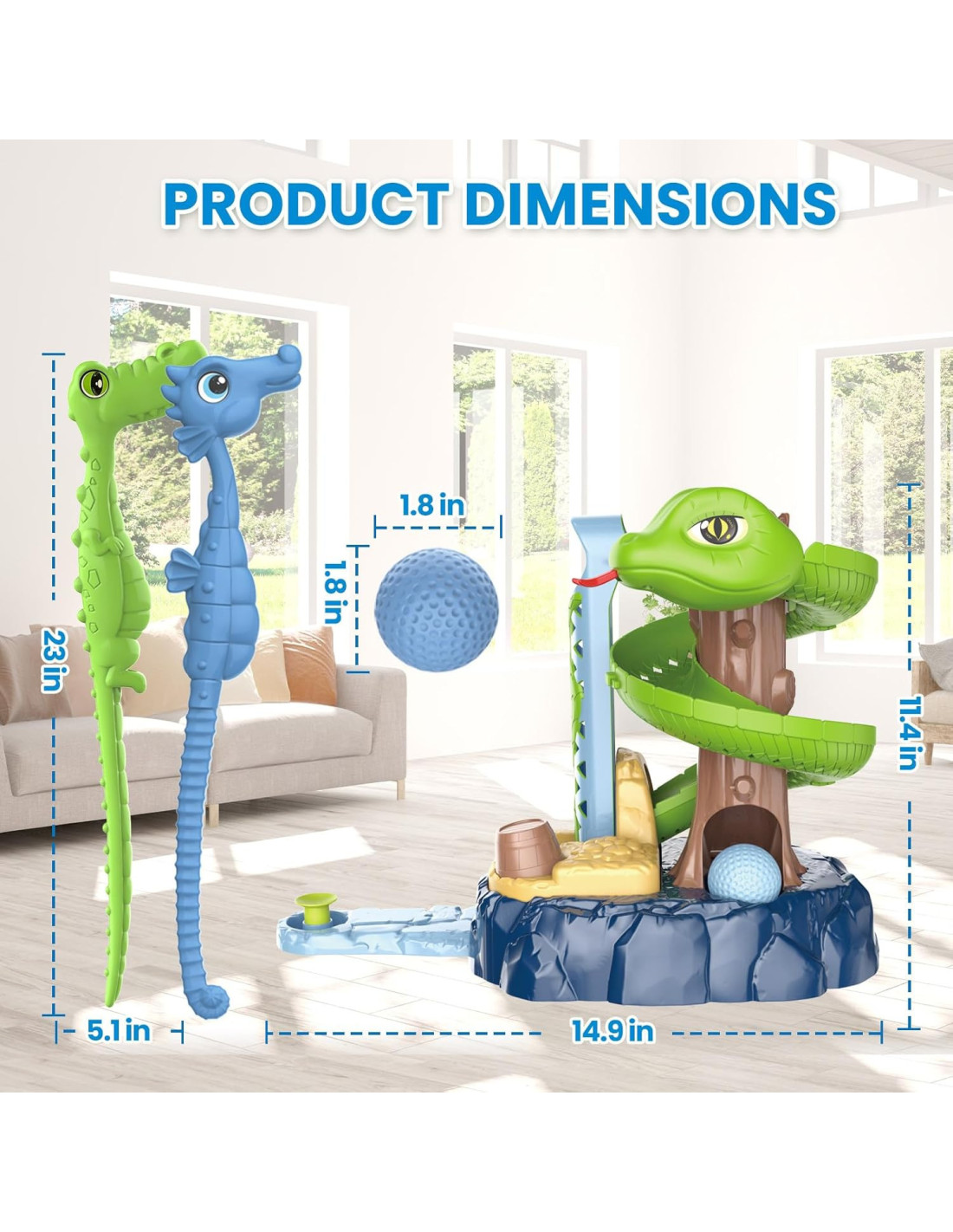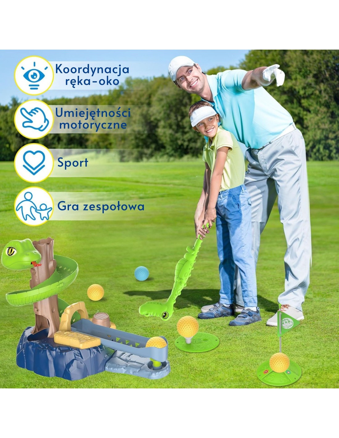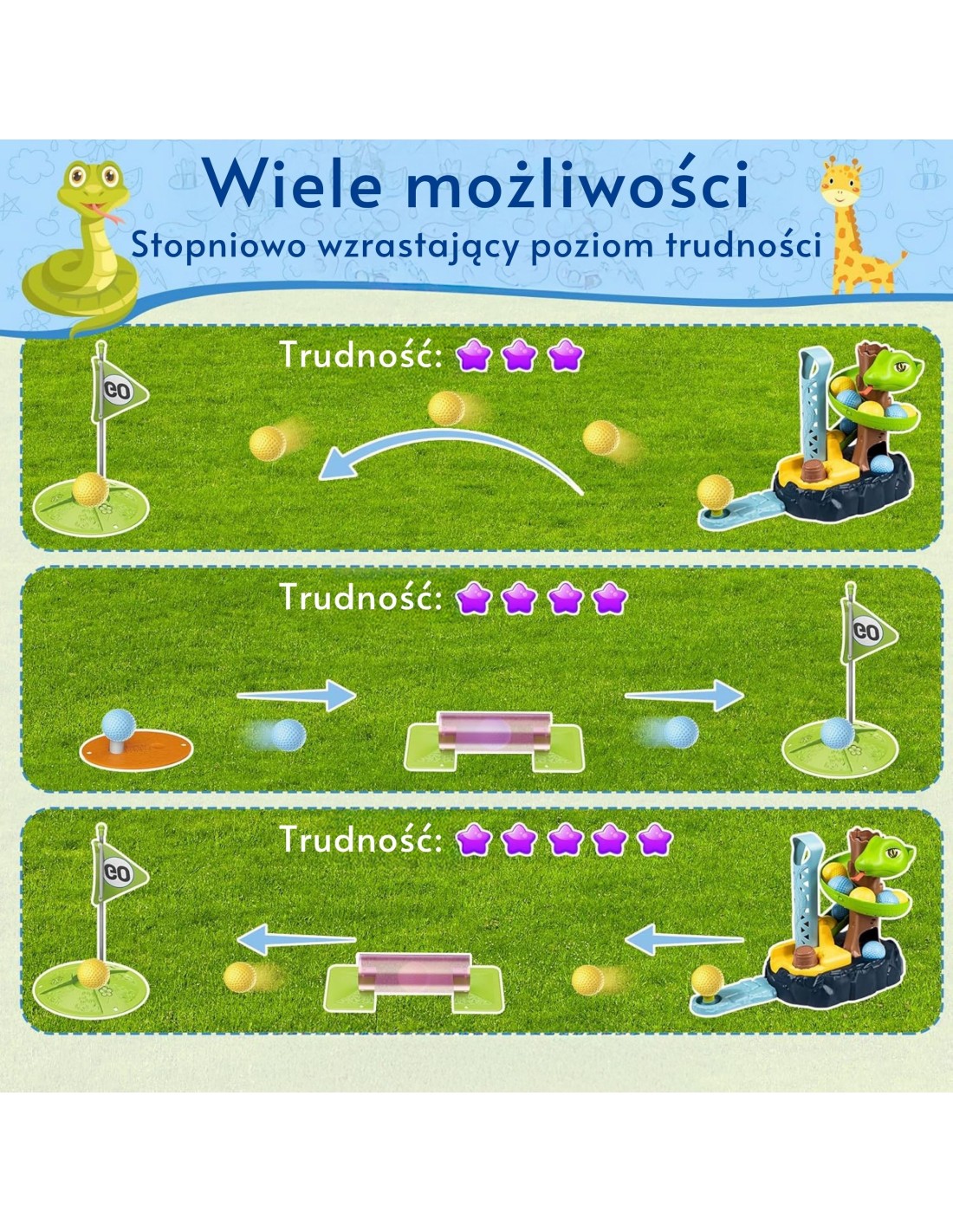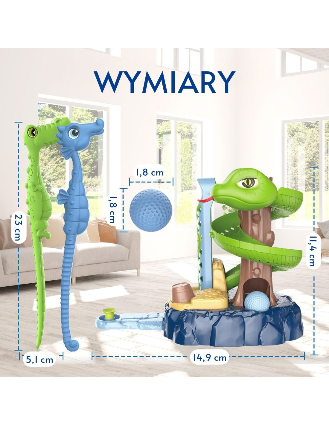 The Snake Golf Skill Game from WOOPIE is an exciting mini golf set for children. The set includes various elements, such as golf clubs, balls, a hole with a flag, and obstacles. The game involves children releasing a ball from a tower, which glides along the track to the starting point. Then, the child must hit the ball so that it lands in the hole, avoiding obstacles. This toy develops manual dexterity, logical thinking, and improves children's concentration. Besides being great fun, playing mini golf with snakes can spark children's interest and teach them the basics of golf.