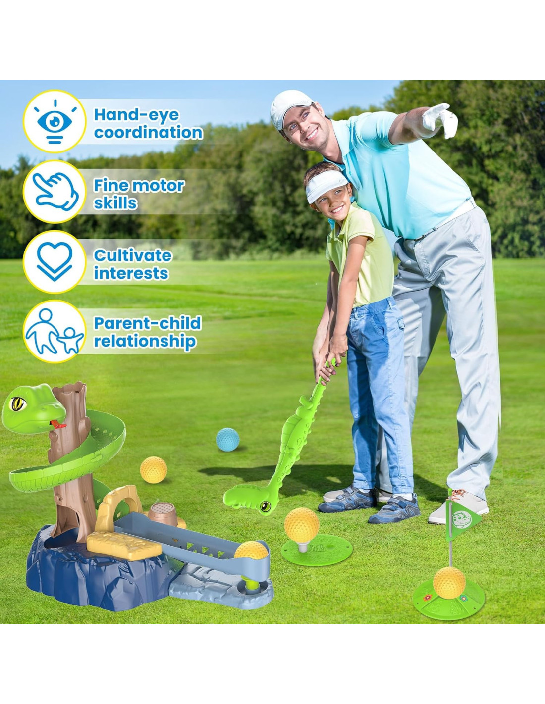 - - manual skills: The child must hit the ball precisely to hit the hole