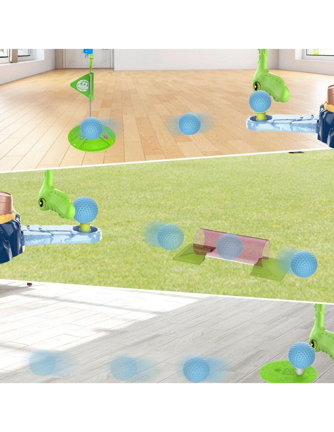 - - set includes: golf clubs - (three designs*), balls, hole with flag and obstacles