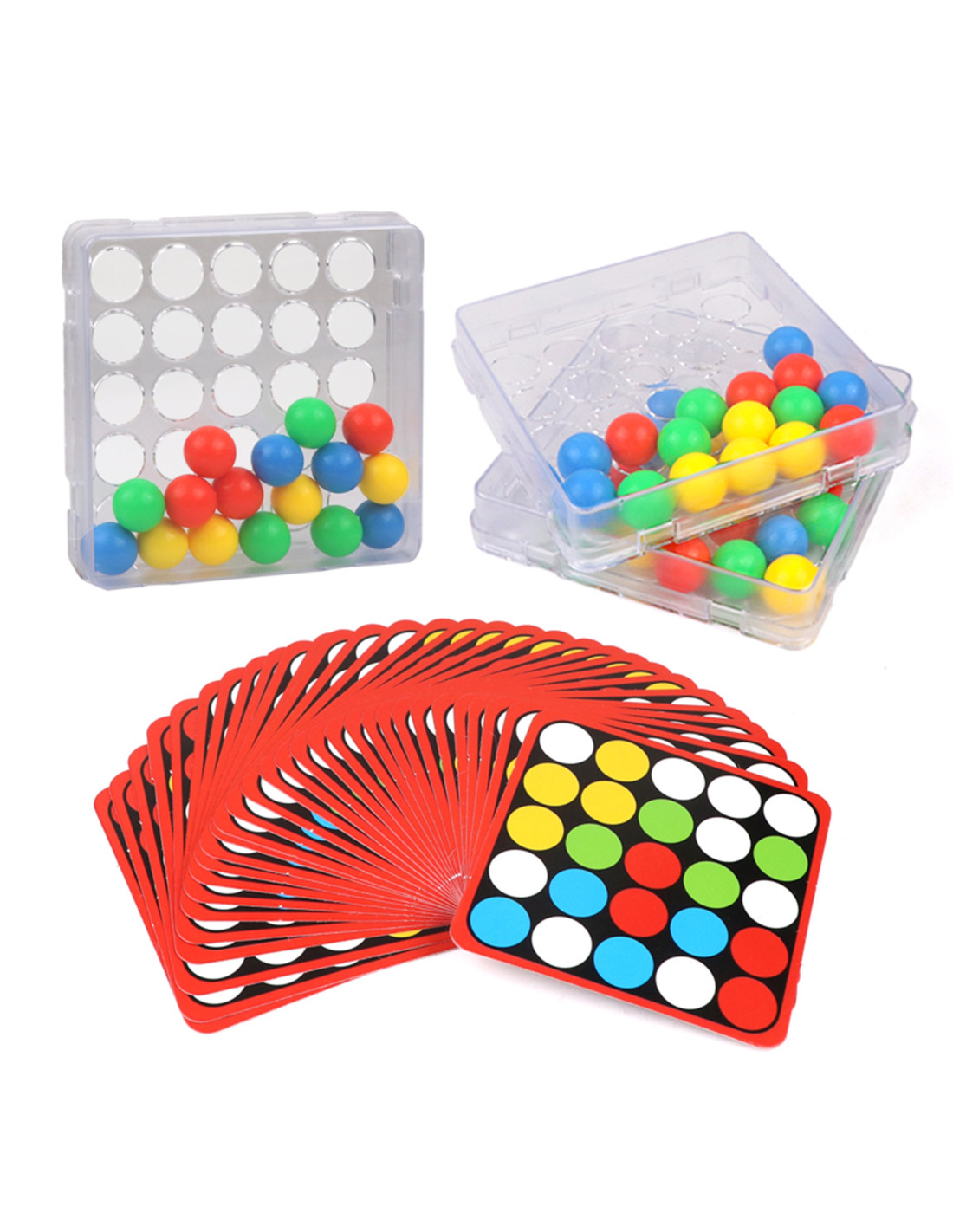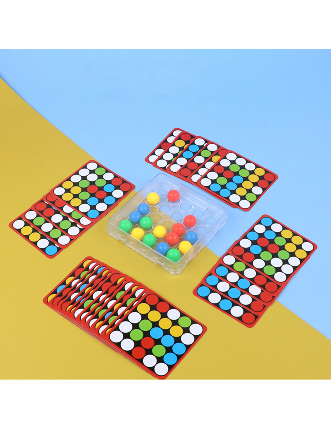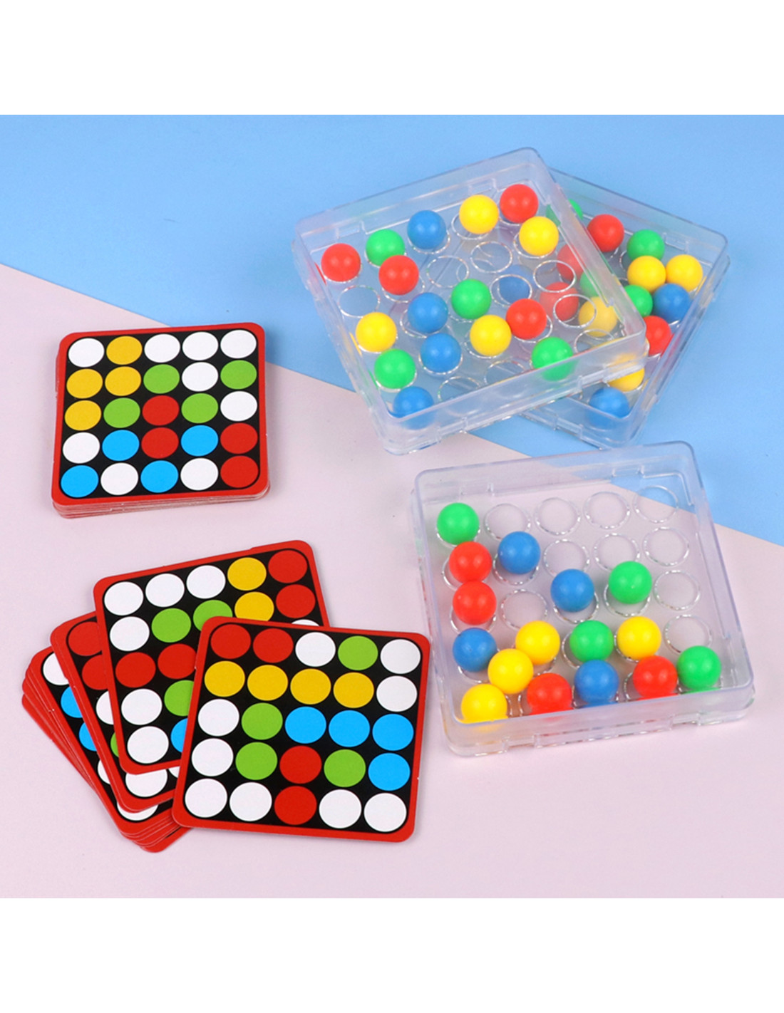 The base with circular holes allows you to move the colored balls inside the box using only your fingers. Each card also includes a universal black-and-white template on the back for children to color and create their own mosaic.