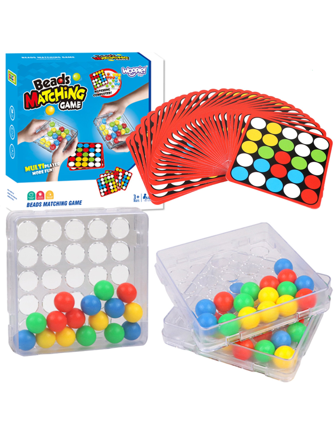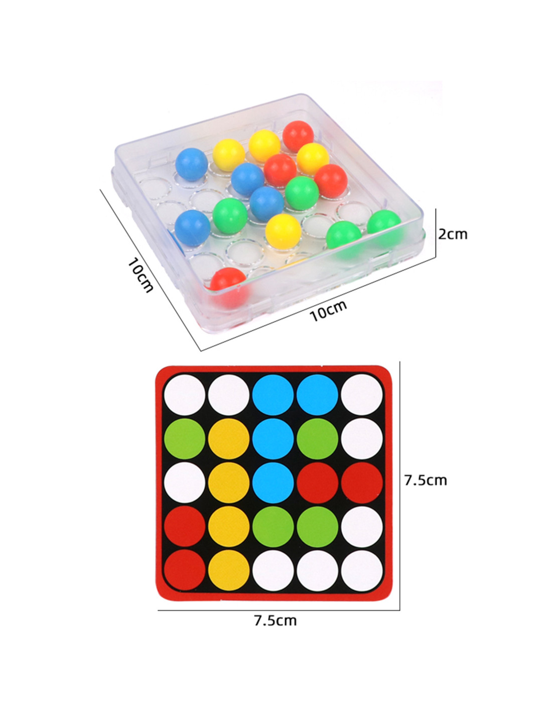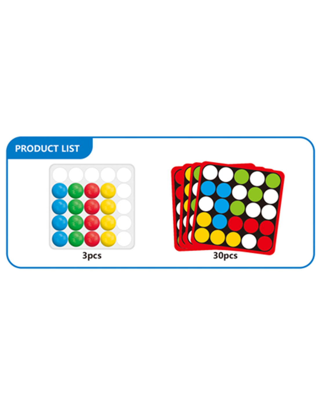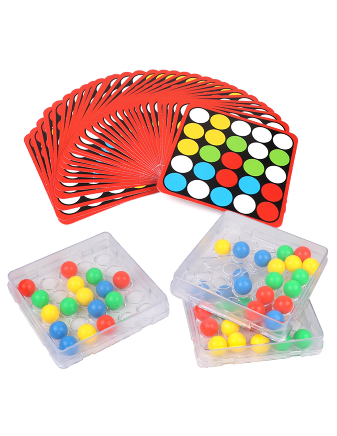 The base with circular holes allows you to move the colored balls inside the box using only your fingers. Each card also includes a universal black-and-white template on the back for children to color and create their own mosaic.