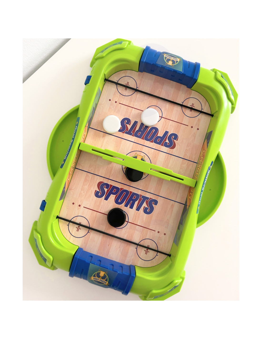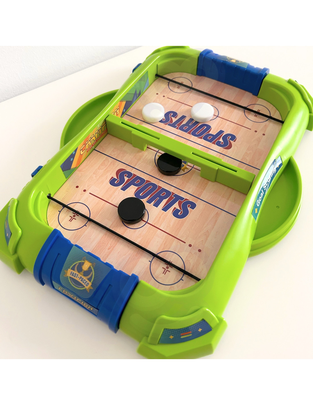 On both halves of the board, rubber bands are stretched for shooting pucks. In the center is a wall with a small opening for the game to begin. On the sides are two shelves into which you can place your won pucks. Each player receives three pieces – now simply stretch the rubber band with the piece and shoot at the opponent's field! The goal of the game – just like in hockey – is to score more goals than the opponent. The player who scores the fewest goals with their player on the opposite side of the court loses.