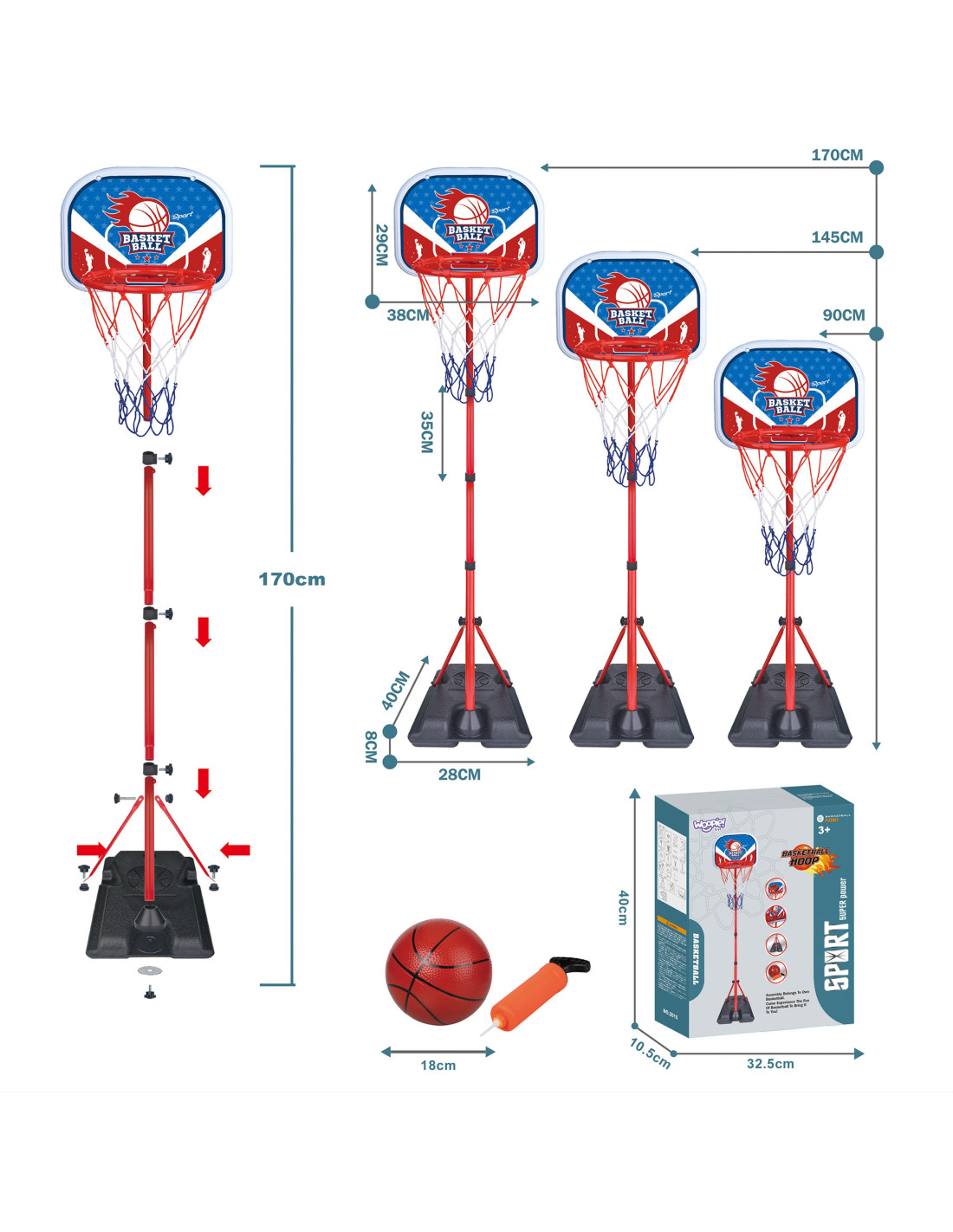 - - The basketball has 3 height adjustments: 90, 145 and 170 cm