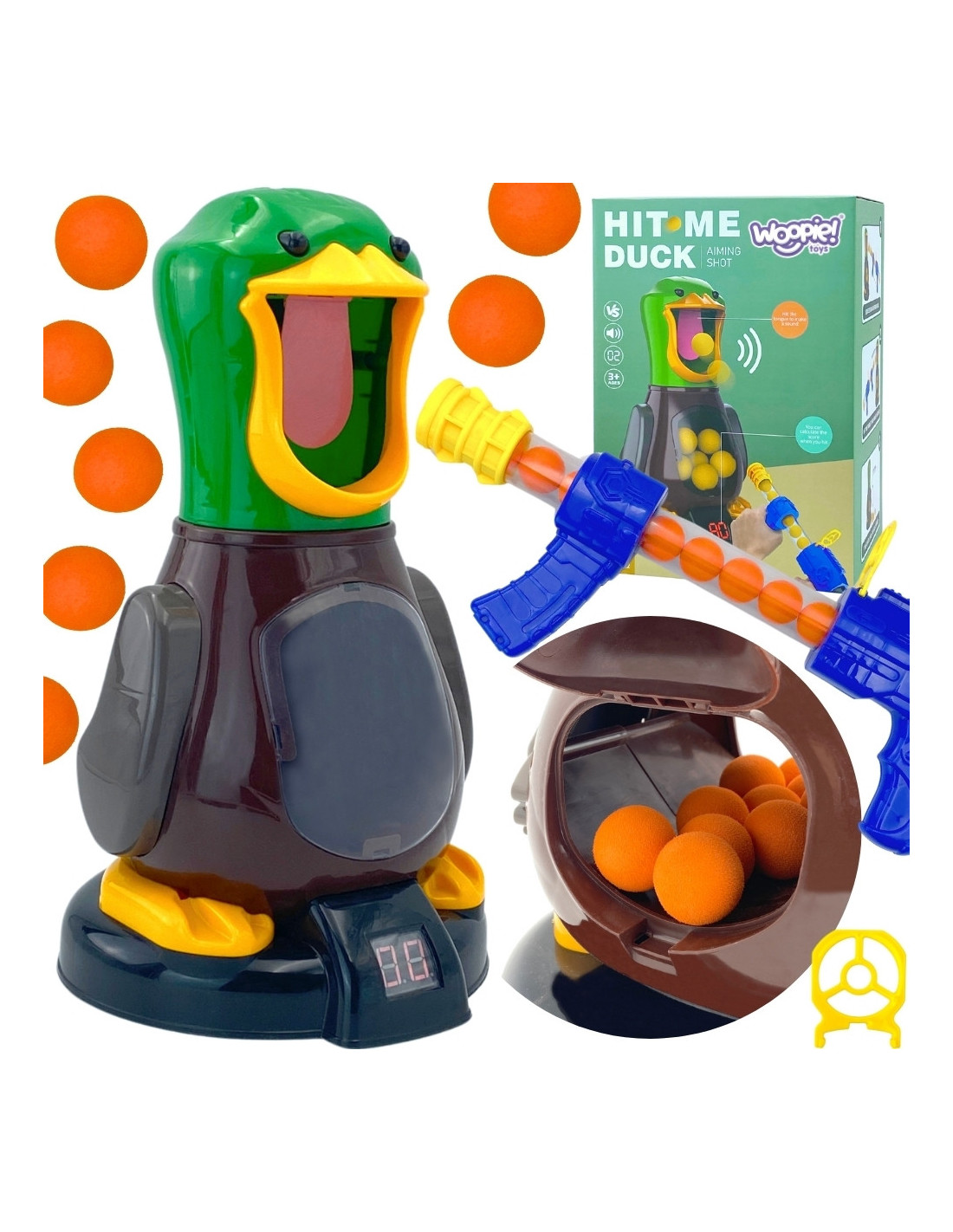 Take your child to the magical world of arcade games with the " Hungry Duck " toy! This dynamic arcade game from the WOOPIE brand will bring a lot of joy to both children and adults. This set is a great way to develop concentration, accuracy, and motor coordination. The goal of the game is to shoot balls into the hole in the duck's beak . Using a special gun, the player must aim precisely and hit the ball into the duck. For each hit, the duck counts points, which are displayed on the screen at its base. The game can be played solo or in a competitive mode , where players compare their scores.