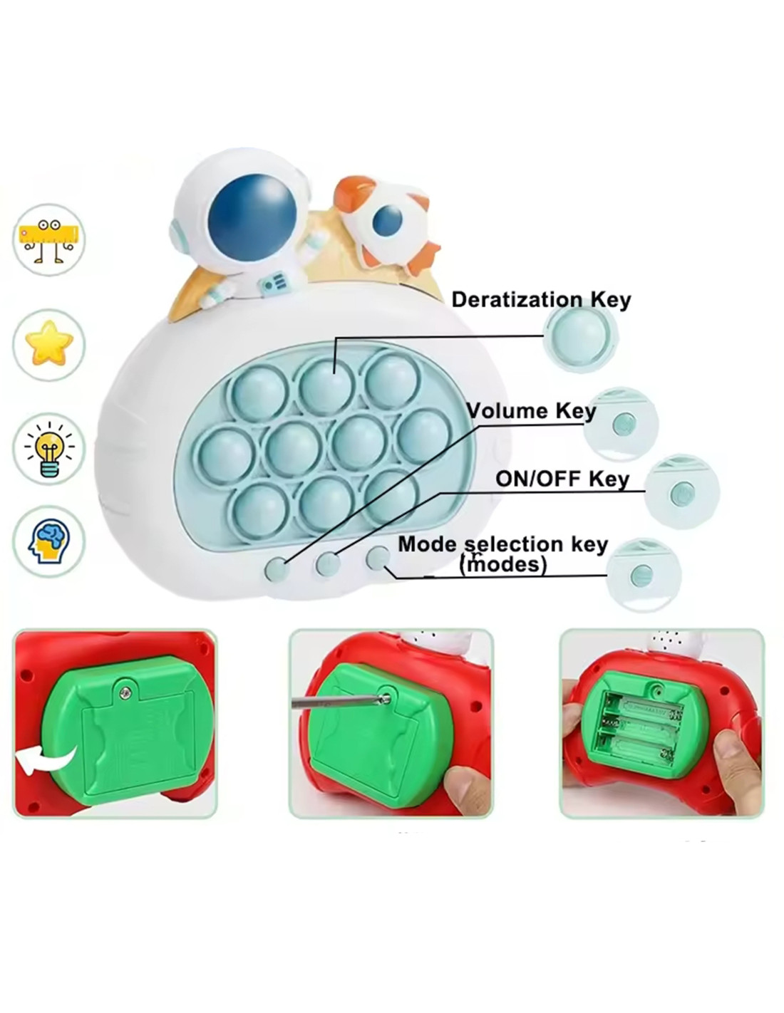 The POP IT Space game is a stress-relief toy perfect for even the youngest players. The game produces cheerful sounds that encourage children to play and add variety to the gameplay. The toy's small size makes it easy to take with you. Pop It is a delight for children and adults alike , who eagerly reach for it. It develops the mind, manual skills, and hand-eye coordination, and trains observation skills, helping to combat stress.