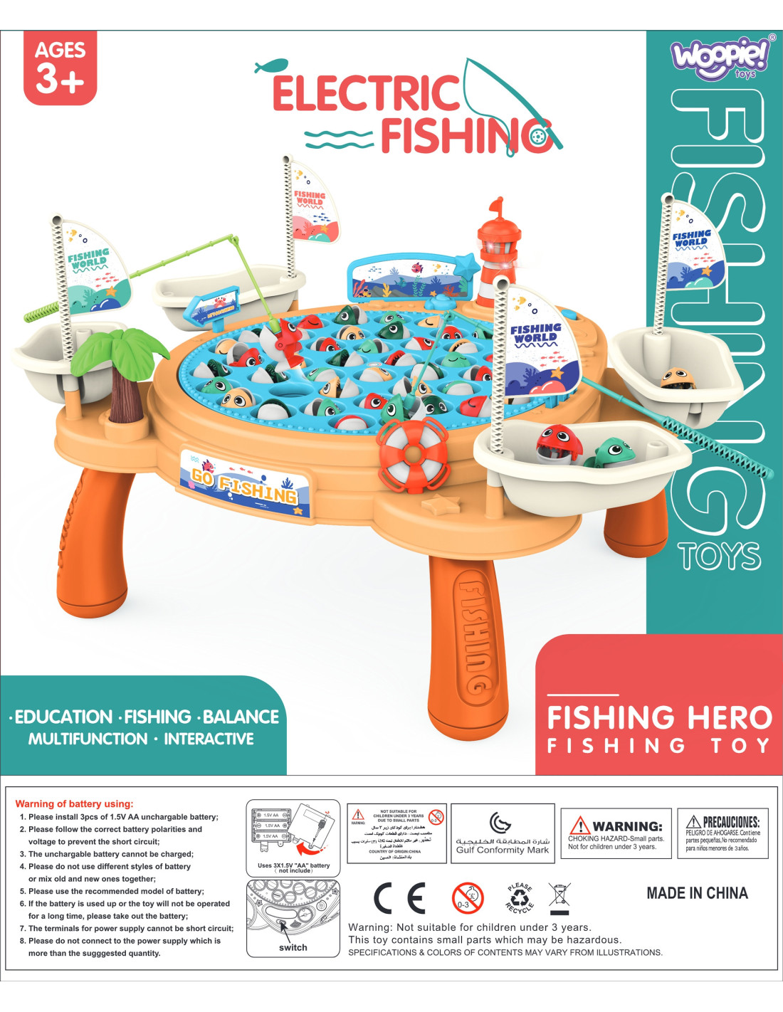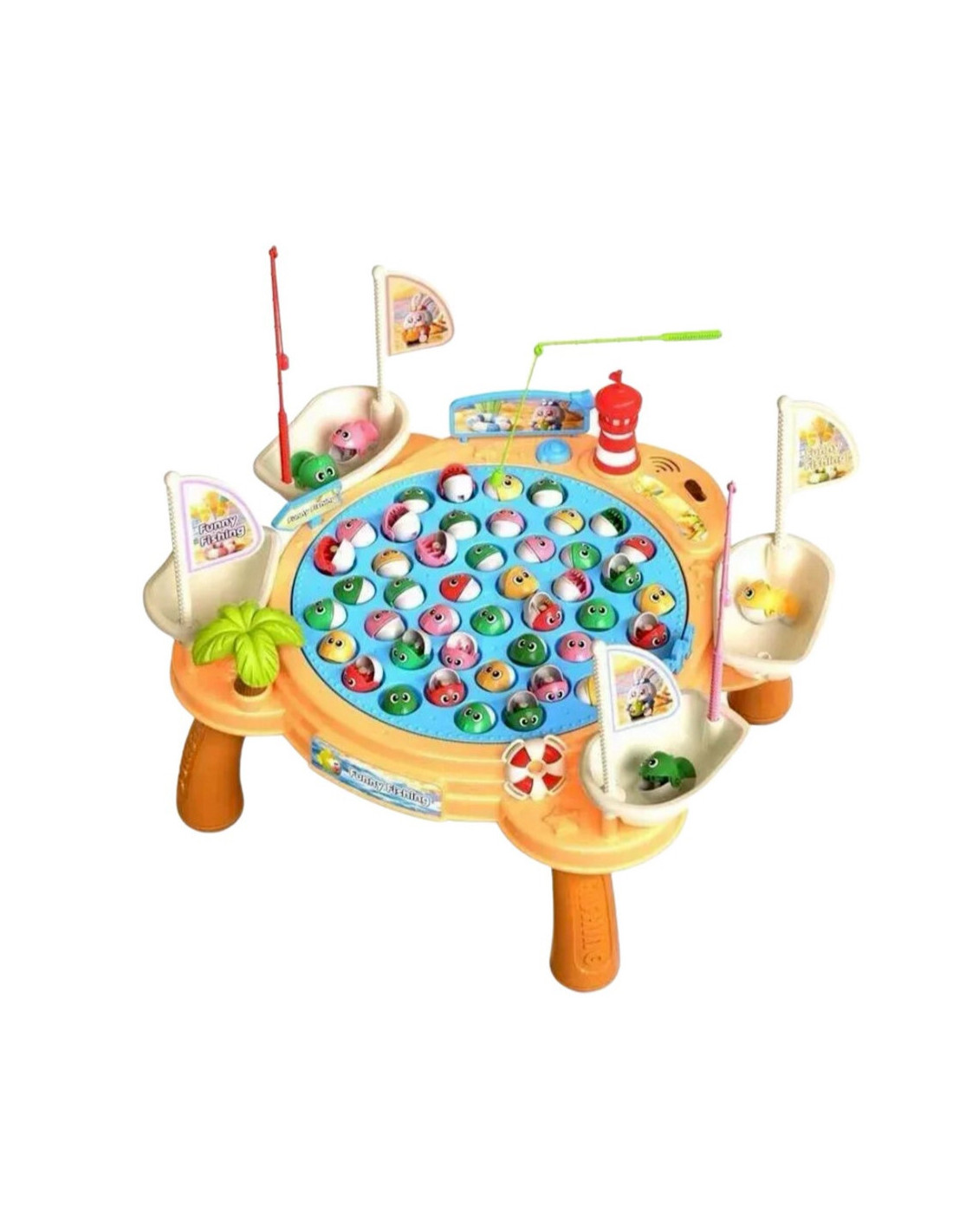 "PIRATE SHIP" Magnetic Fishing Game from Woopie is a play table that transports children to the fascinating world of fishing, teaching patience, concentration , and dexterity . This interactive table offers the opportunity to play fishing with magnetic rods, but also features a rotating base with fish. Music plays during play , adding even more variety! The table is equipped with seating for four players, each with a personal fishing rod and a pirate ship for depositing caught fish . The winner is the player with the most fish.