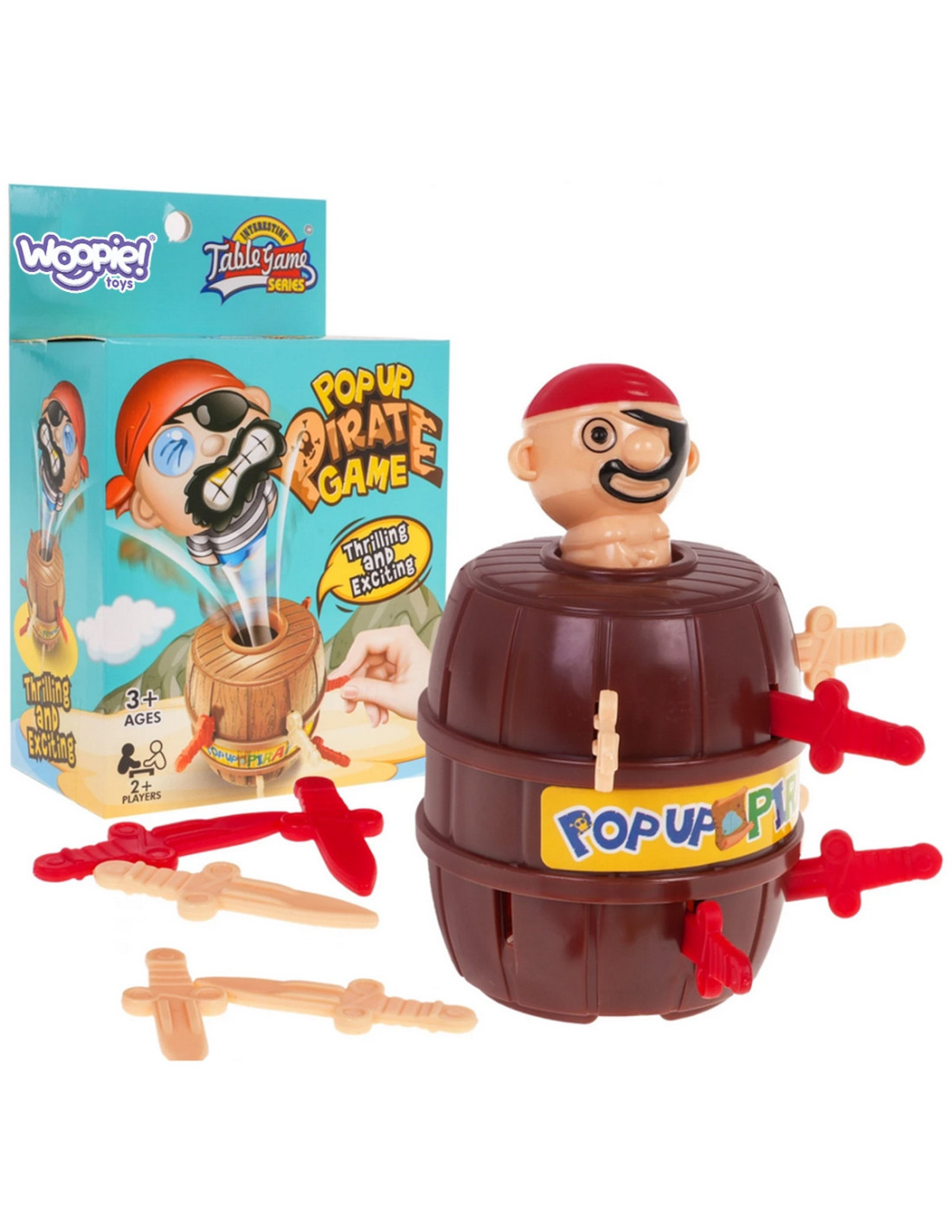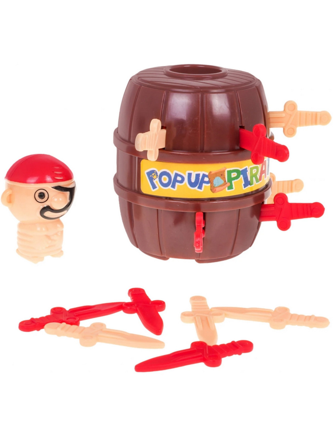 Place the pirate in the barrel with his head sticking out. Twist it several times. Deal out an equal number of swords to each player. Each player takes turns inserting one sword into the barrel's opening . Be careful not to stab the pirate. If struck, the pirate will shoot out of the barrel like a slingshot, and you lose. The first player to insert all their swords into the barrel, or to insert more swords than the other players before the pirate jumps out, wins .