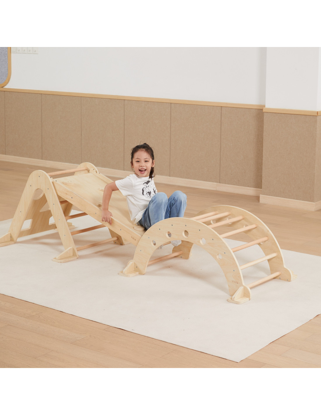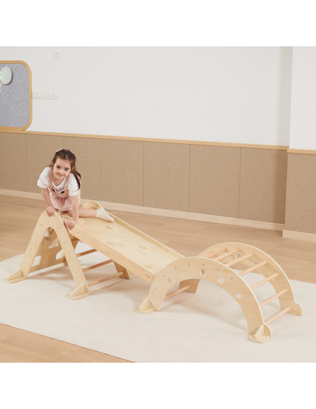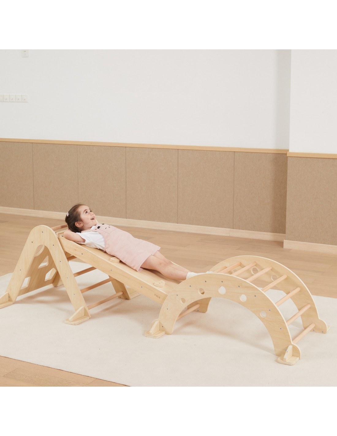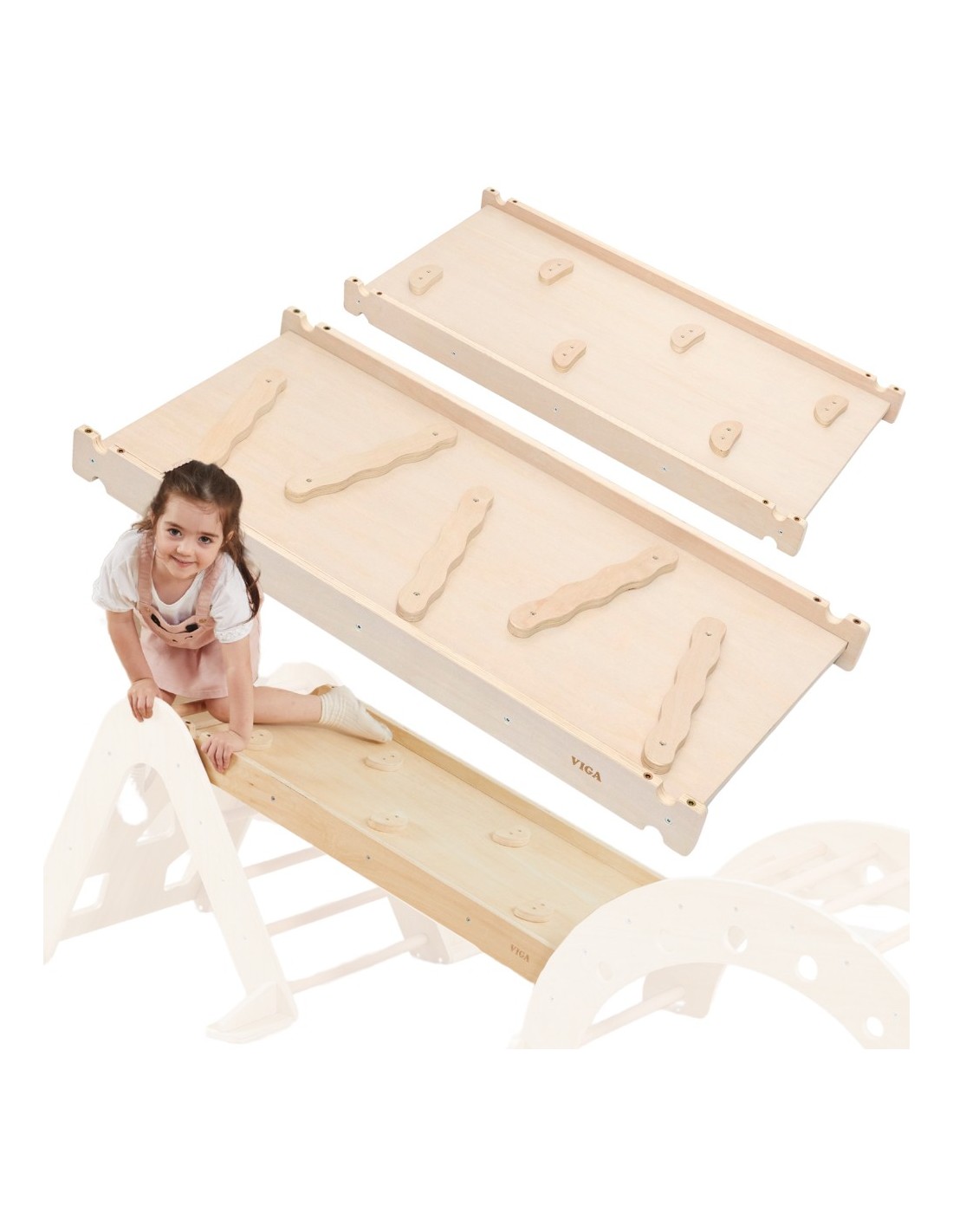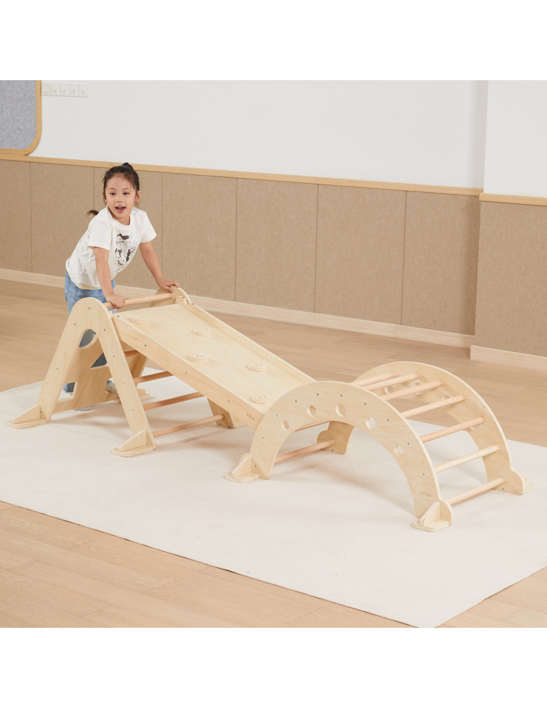 The Wooden Slide from VIGA is a multifunctional home playground element that connects to the Rocker (44710) and Climbing Triangle (44708). One side features a flat surface that can be used as a slide or walkway, while the other side features a climbing wall.
