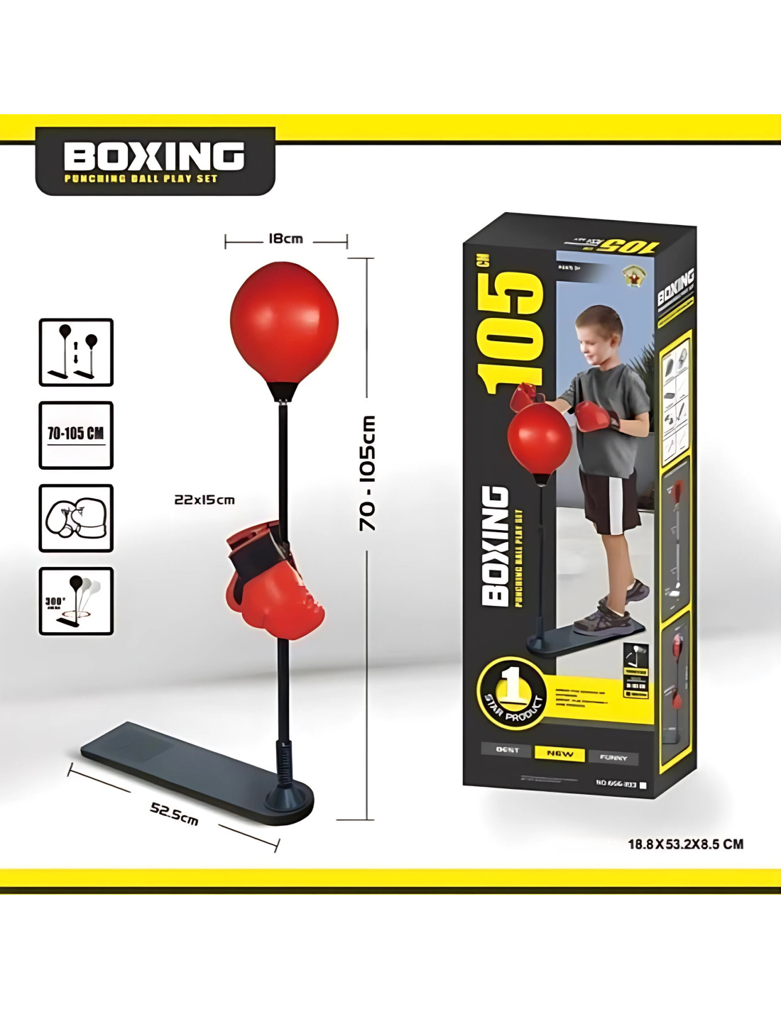 The Woopie Adjustable Standing Punch Boxing Set is the perfect choice for kids who want to be active and feel like true ring champions! This toy provides tons of fun, allows you to burn off energy, and hone your skills, all while guaranteeing great fun both indoors and outdoors. The set includes boxing gloves and an adjustable stand with a punch ball, allowing you to customize the set to your child's needs.