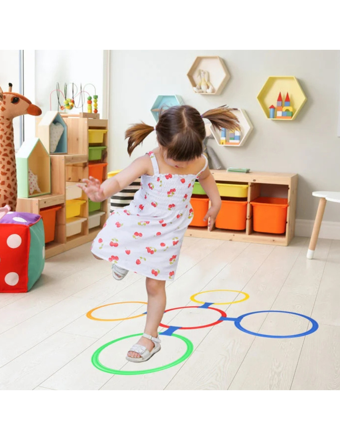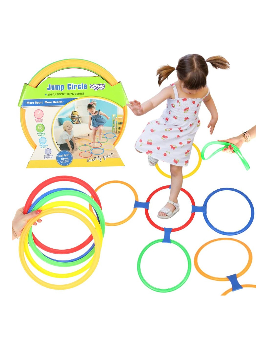 Keep your child active with this set of colorful jumping rings from Woopie. This set is perfect for kids who love movement and skillful play. Thanks to the colorful rings and flexible connectors, you can create an endless number of layouts – from simple obstacle courses to creative team game boards. This product not only provides great fun but also supports physical development, motor coordination, and logical thinking.