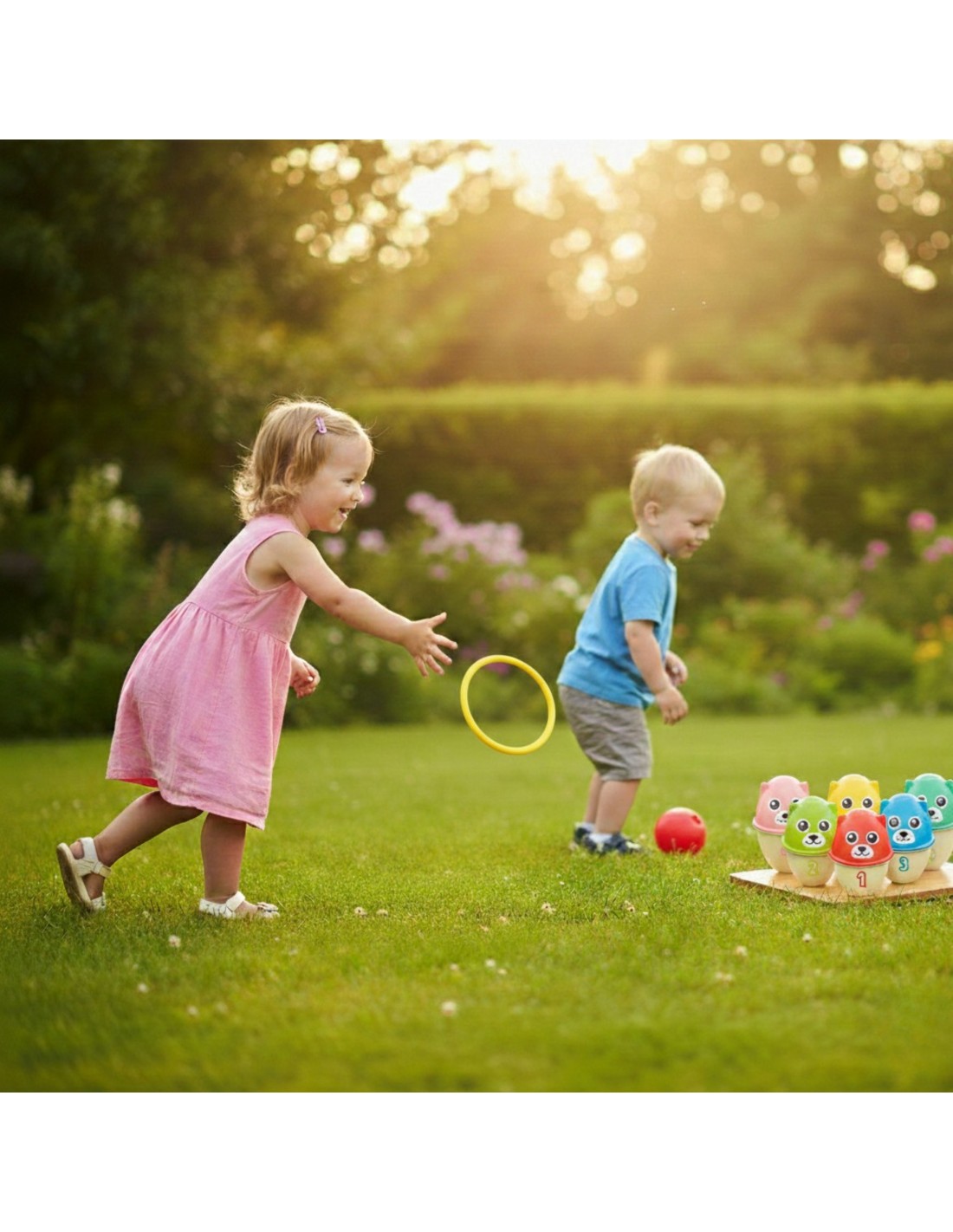 The Woopie Colorful Bears Bowling Set for Kids is an innovative, educational toy that combines the joy of bowling with learning through action. The set includes colorful teddy bears with numbers that serve as pins, as well as balls for knocking them down and hoops for throwing, providing a wide variety of play options . Each teddy bear has a different color and number, allowing children to learn color and number recognition . By throwing the ball or hoops at the bears, children develop hand-eye coordination, fine motor skills, and planning their actions . Thanks to its attractive design and diverse functions, the set is perfect for both independent play and spending time together with parents or peers. The toy is made of durable, child-safe materials that are pleasant to the touch and resistant to damage. The teddy bears can also be stacked into a tower by nesting them one inside the other like cups. Various game modes—throwing hoops, knocking down pins, counting numbers—ensure your little one not only has fun but also learns intensively. This is a perfect gift for any child, guaranteeing not only smiles but also the active development of cognitive, manual, and social skills . Perfect for home, nursery, preschool, or family trips.