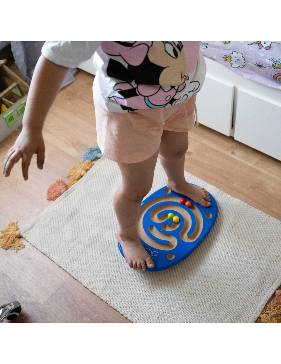 - - the child's task is to balance on the board in order to maintain balance and bring the colored ball to its place,