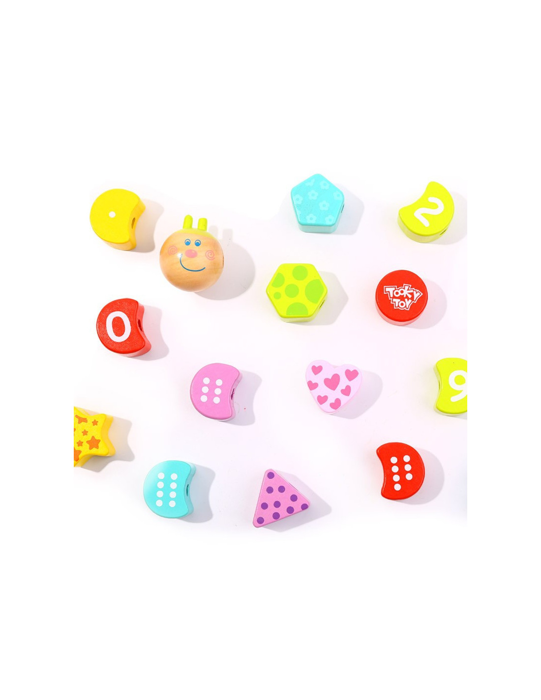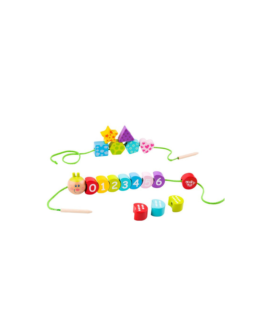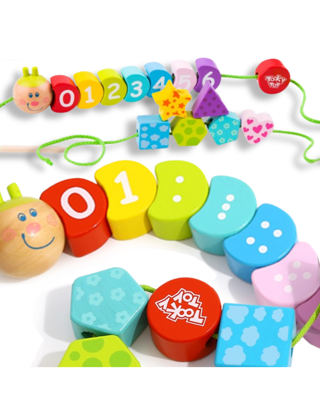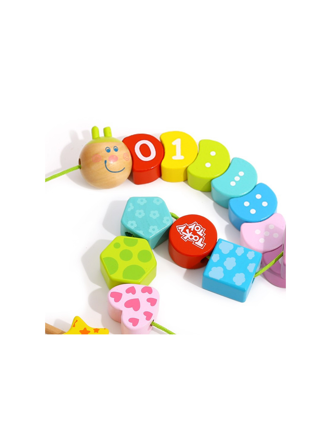 TOOKY TOY Lace-Up Caterpillar is a wooden toy for children, allowing them to create a charming, colorful caterpillar with a bright, smiling face. This is a great game for developing fine motor skills , essential for early development. This toy will provide hours of fun as they thread the yarn through the holes. Each piece is made of high-quality wood and painted with non-toxic paint. Threading and lacing develops small-finger coordination and patience . This wooden educational toy offers many possibilities, such as lacing the numbers in the correct ascending or descending order, lacing only even numbers, and recognizing colors and shapes. The absence of sharp edges makes this product 100% safe for children.