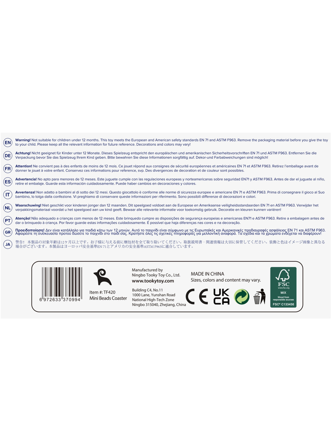 - Ningbo Tooky Toy Co.,Ltd. | Building C4, No 11 1000 Lane Yunshan Road, National High-Tech Zone | Ningbo 315040, China | tooky@tookytoy.com
